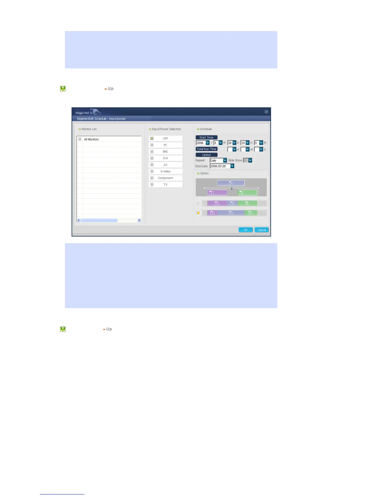 You can register the input source or Power Off for the monitor with the schedule.