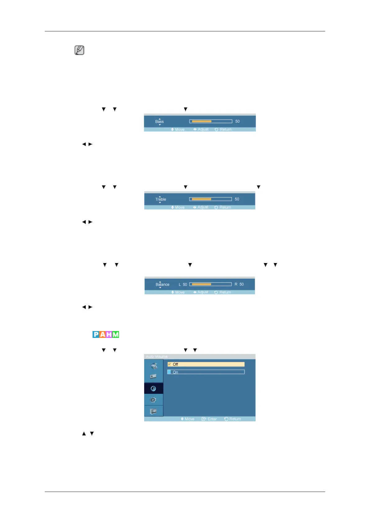 MENU → → → ENTER → [Sound] → → ENTER → [Custom ]→ENTER→ [Bass]