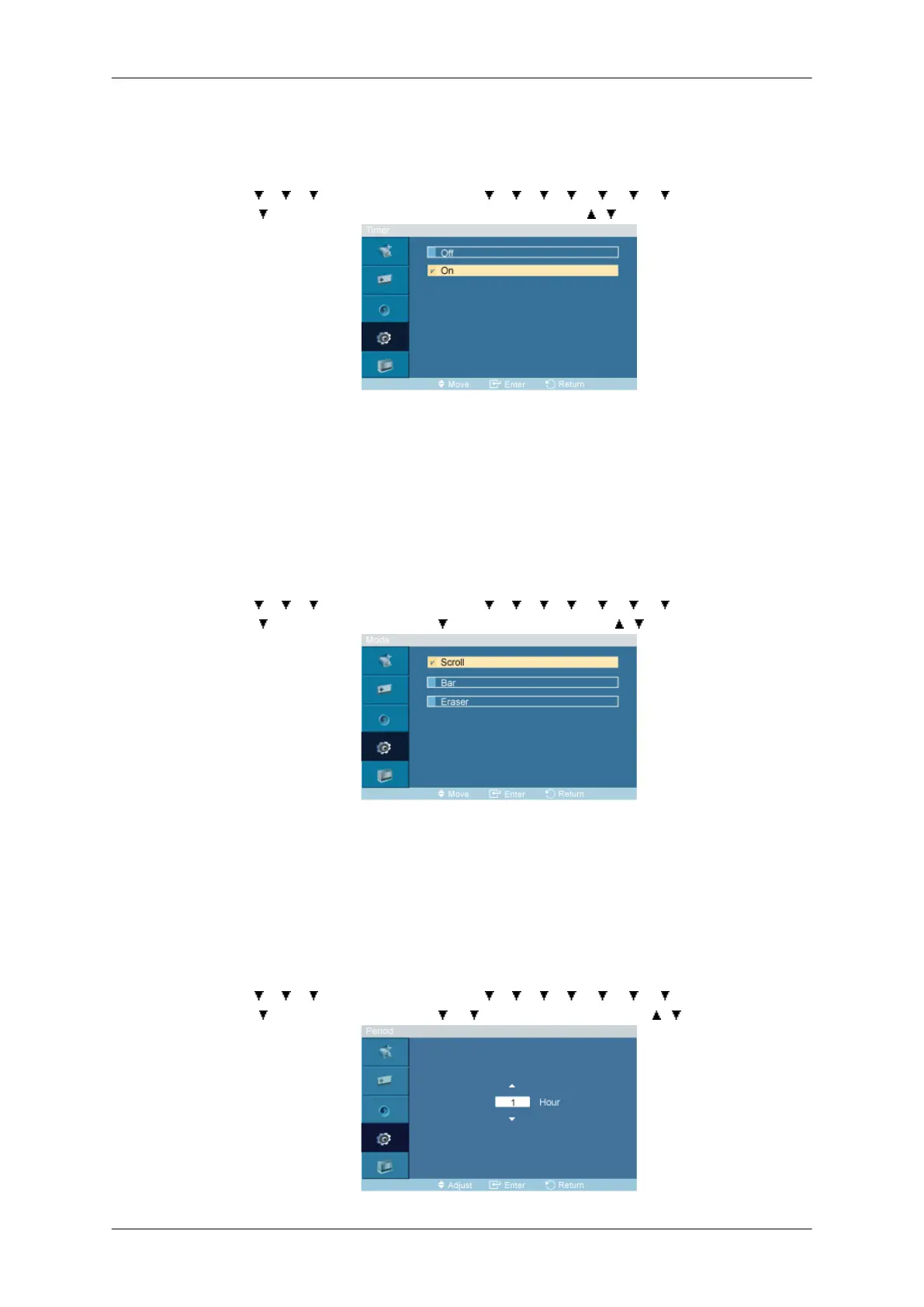 Screen] → → ENTER → [Timer] → → ENTER → [Mode] → , → ENTER