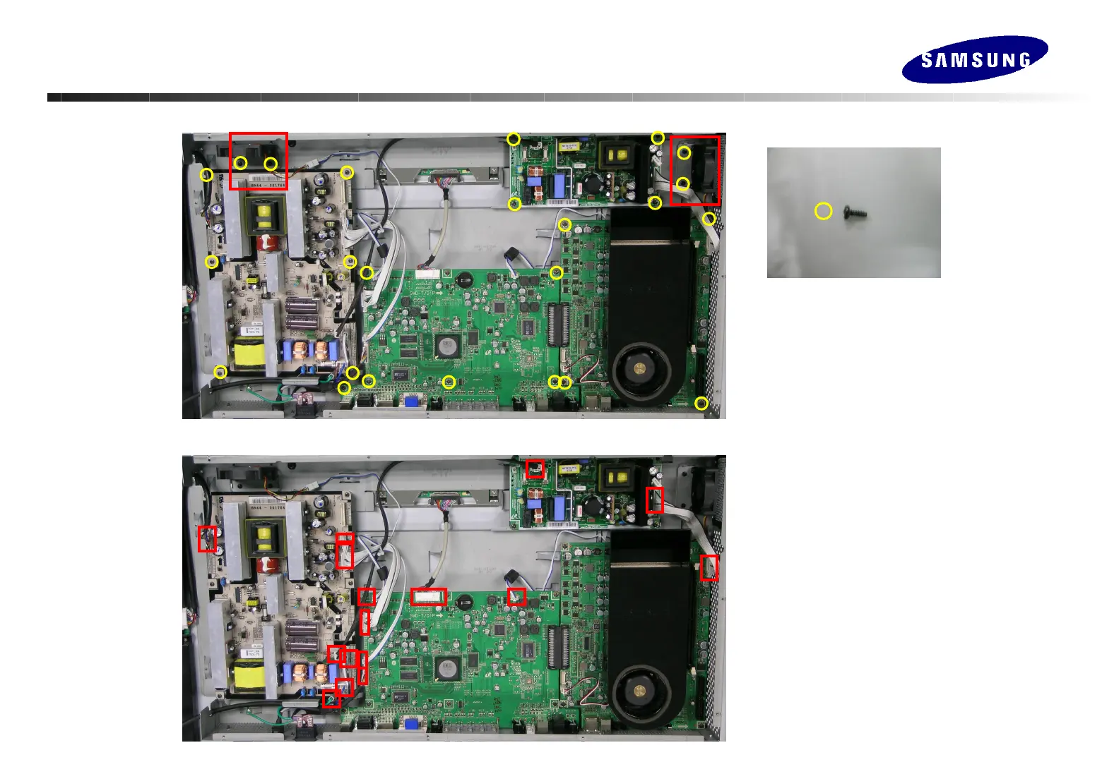 4. Remove the cables and separate the SMPS board and main board from bottom BRKT as showed the picture.