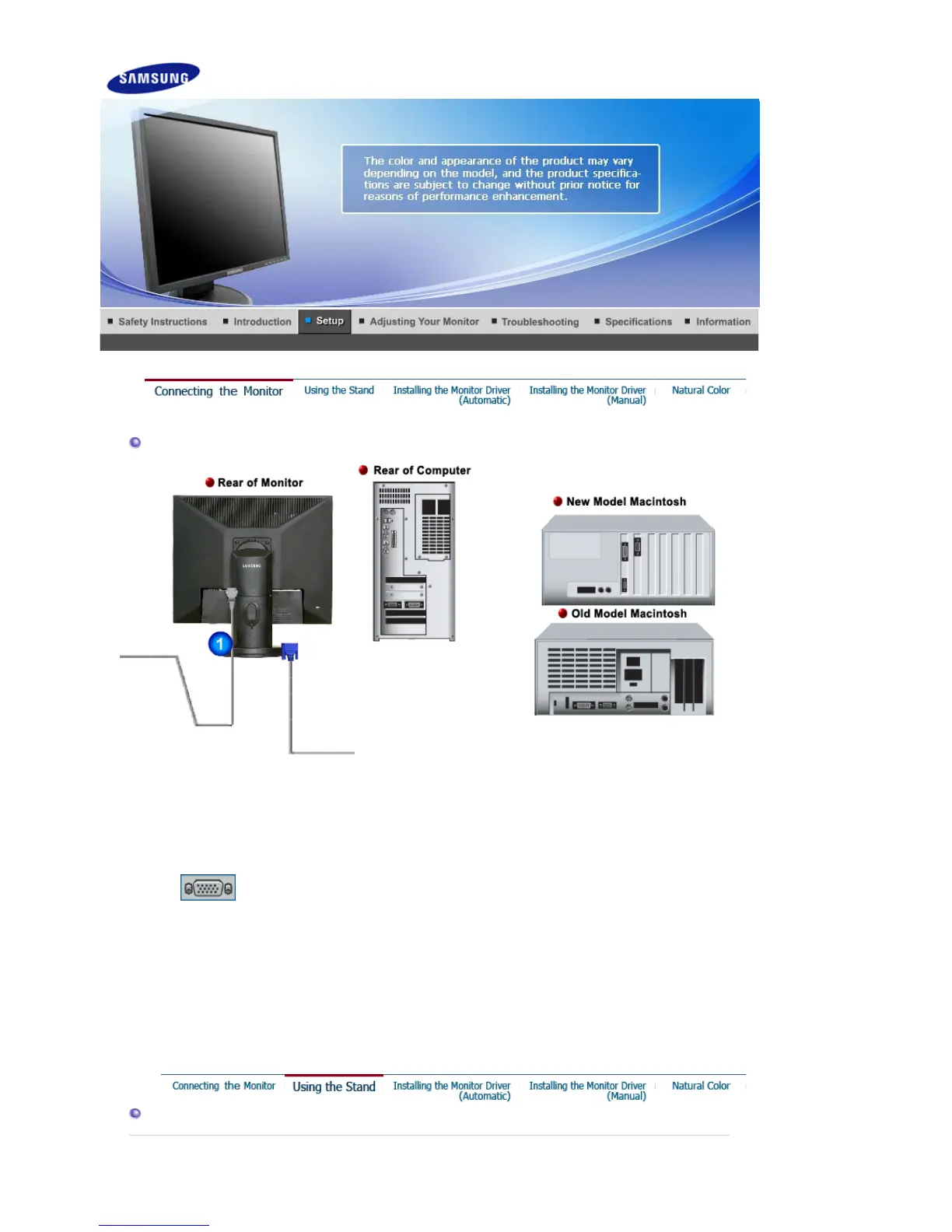 Connect the monitor to the Macintosh computer using the D-sub connection cable.