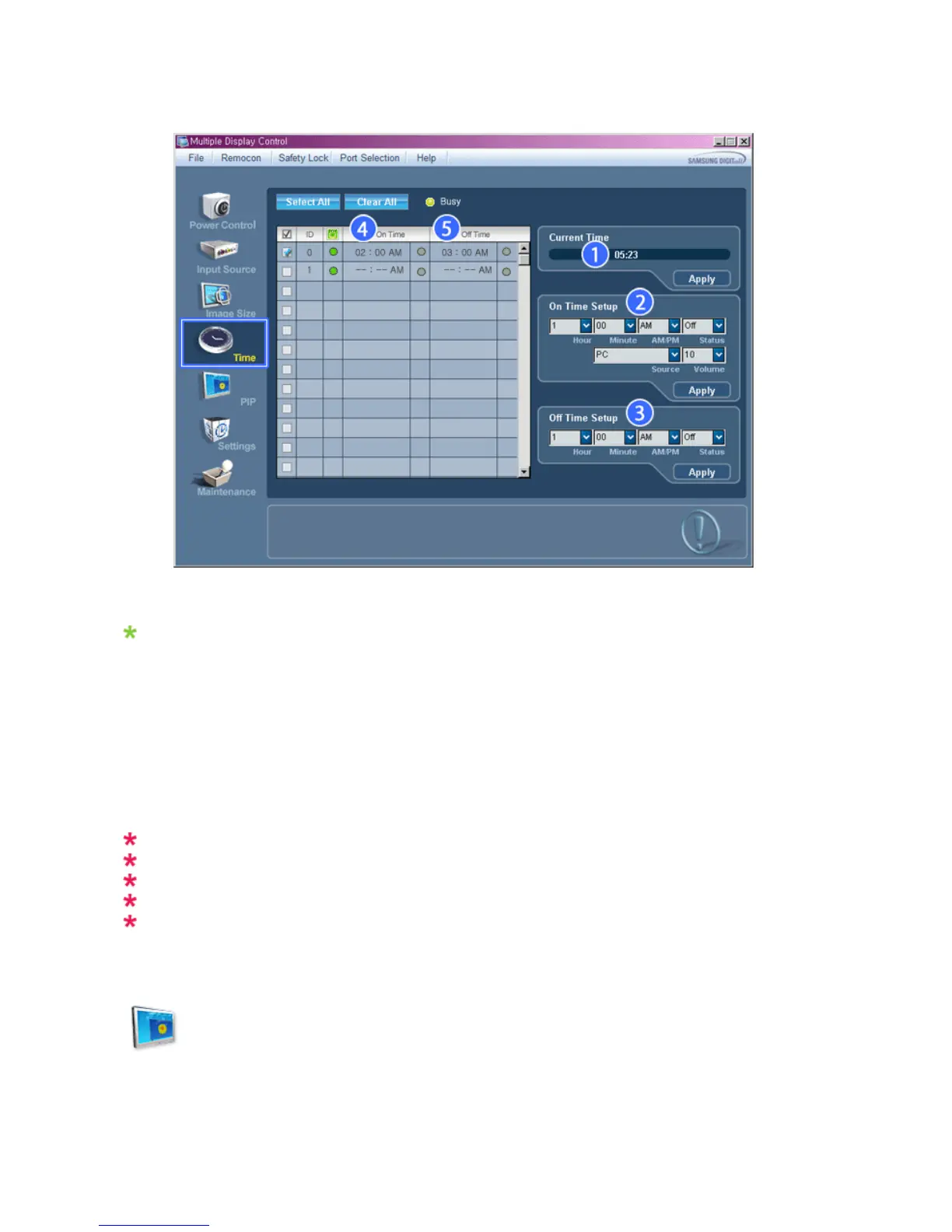 - Set the Hour, Minute, AM/PM of On Time Setup, Status, Source, Volume of the selected display.