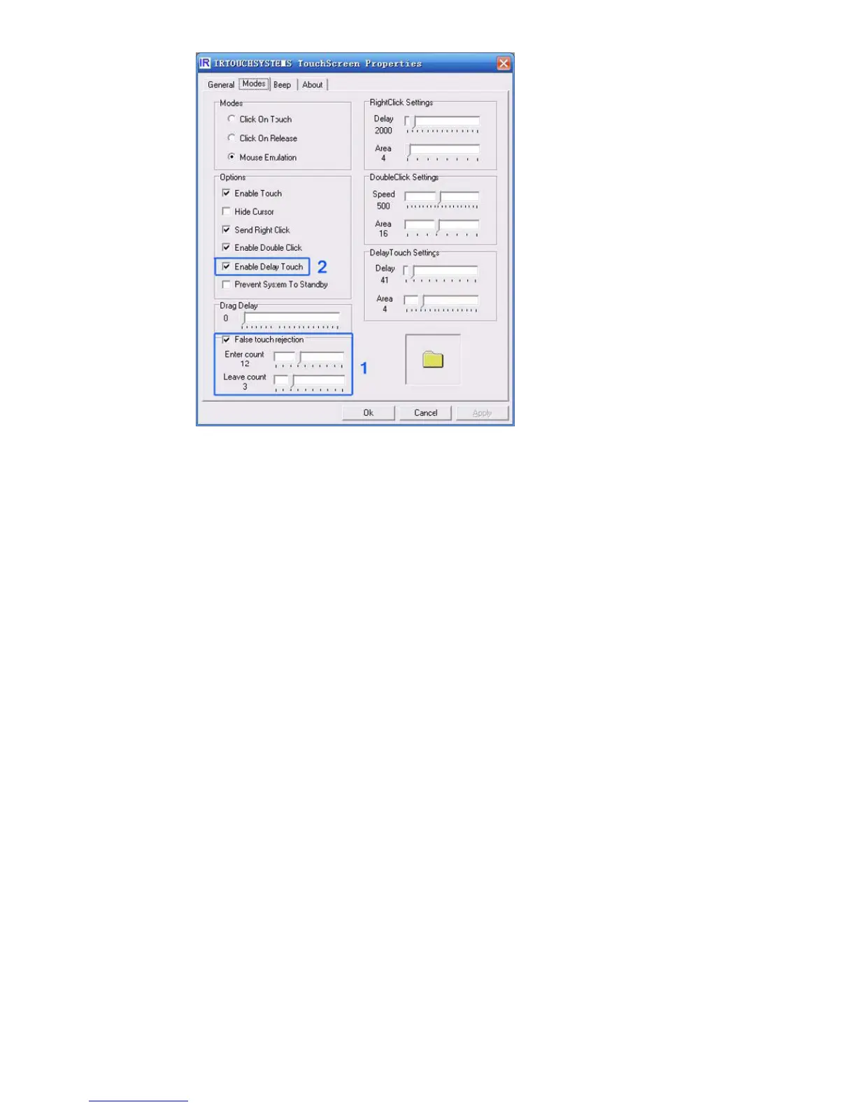 1. Each value should be gradually set in "Delay Touch Settings" after fulfillment of "Enable Delay Touch". "Delay" is set to 40 and