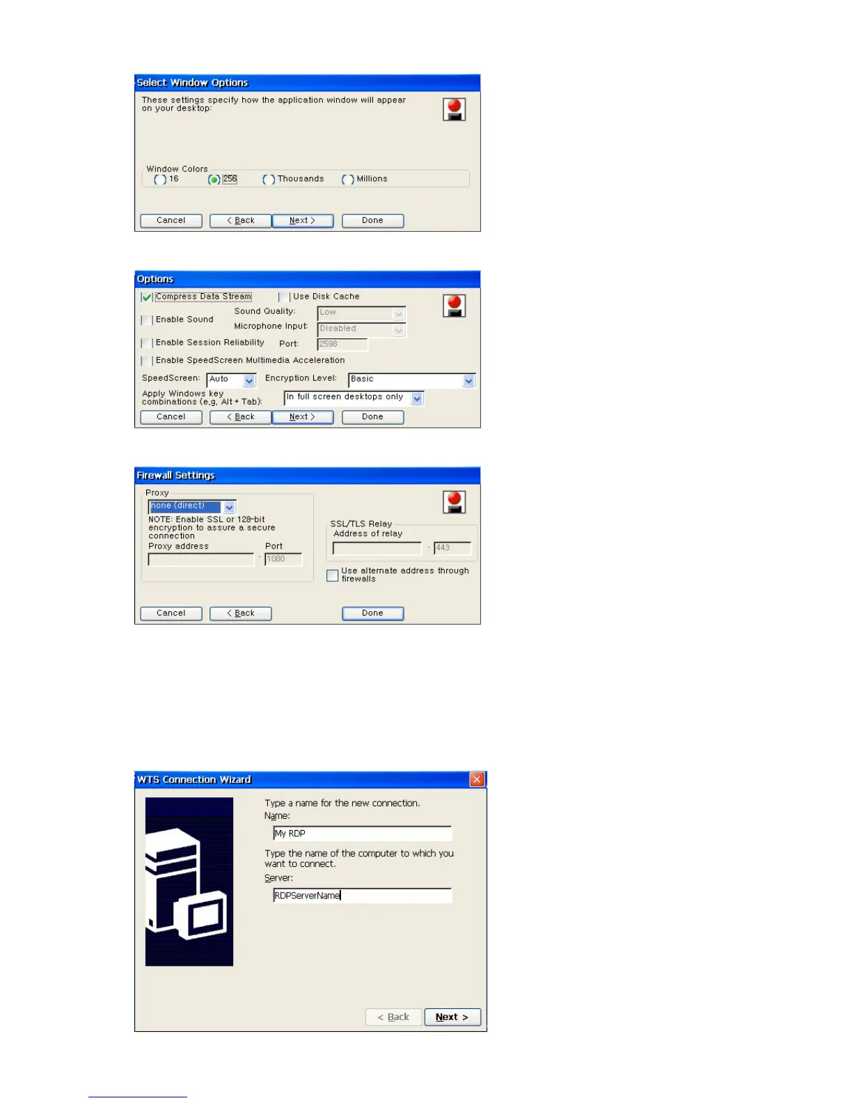 6. Select compression, encryption, and sound options for ICA connection.