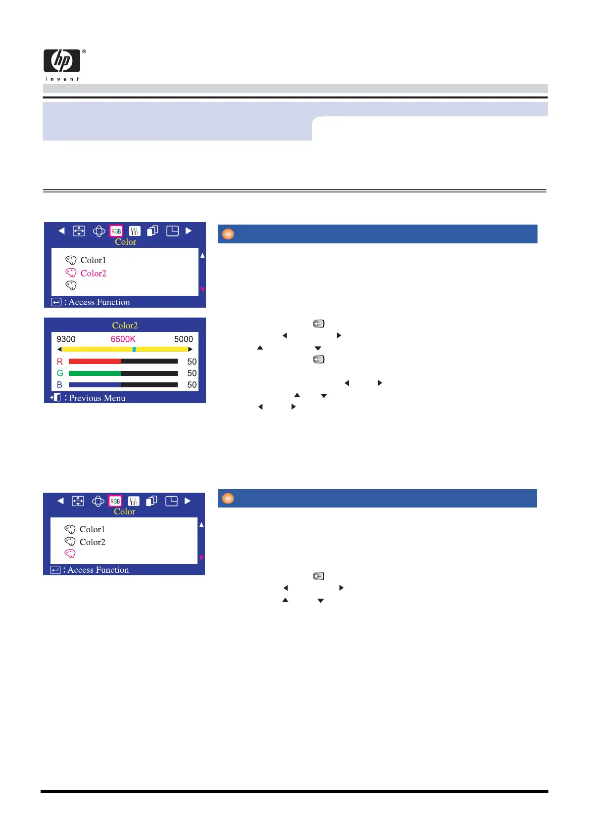 hue,use the or button to select R(ed), G(reen) or B(lue), then use