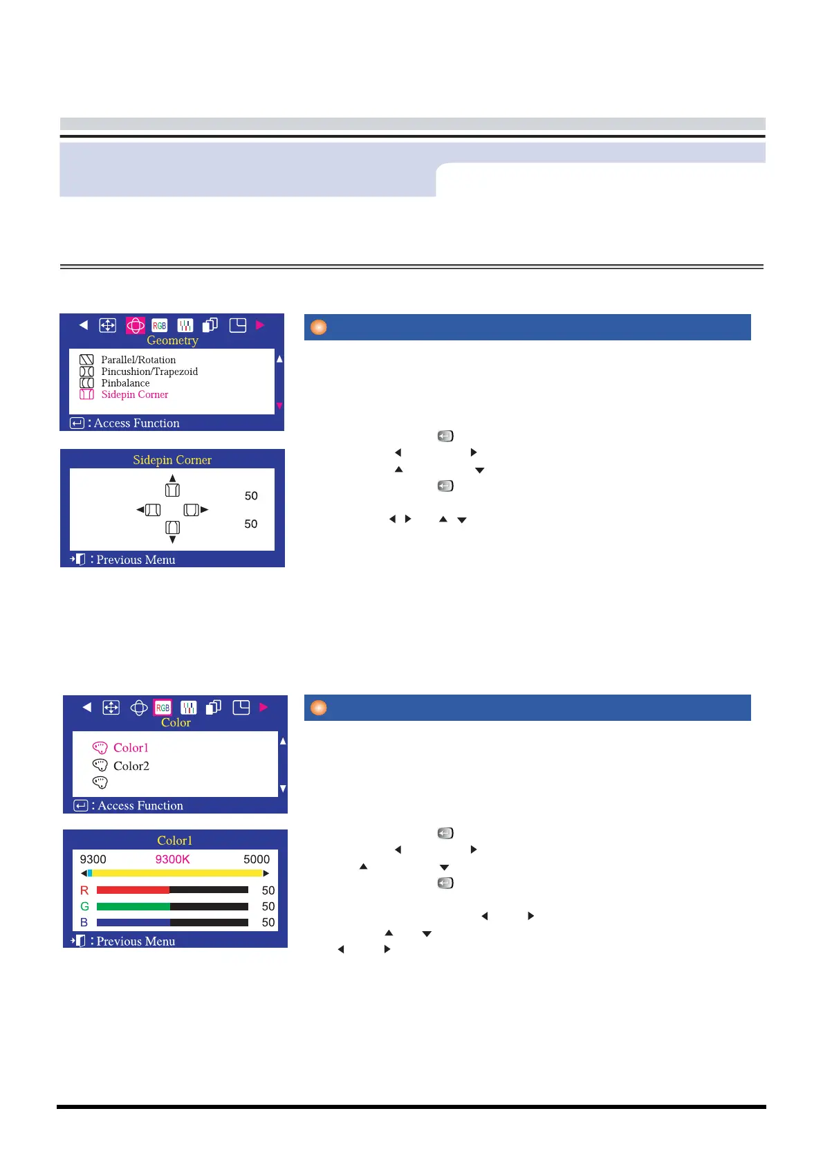 3 Push the Menu( ) button to open the SidePin Corner adjustment