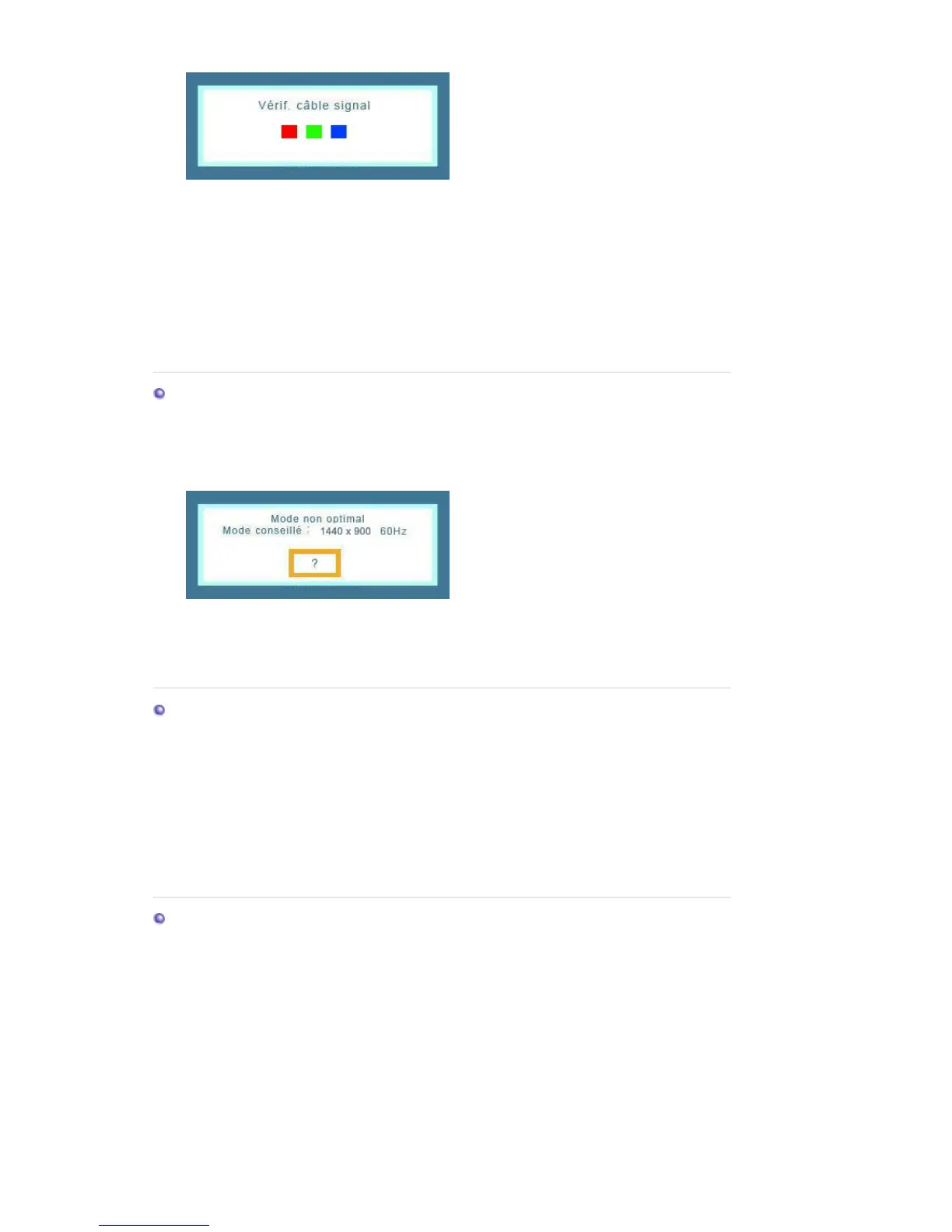 { S'il y a un message sur l'écran ou si l'écran devient blanc, cela signifie que le moniteur