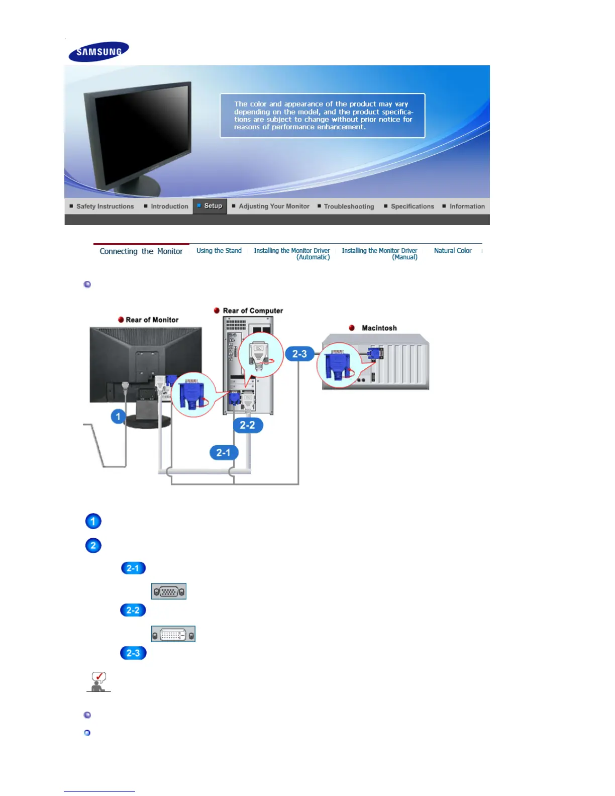 Connect the monitor to the Macintosh computer using the D-sub connection cable.