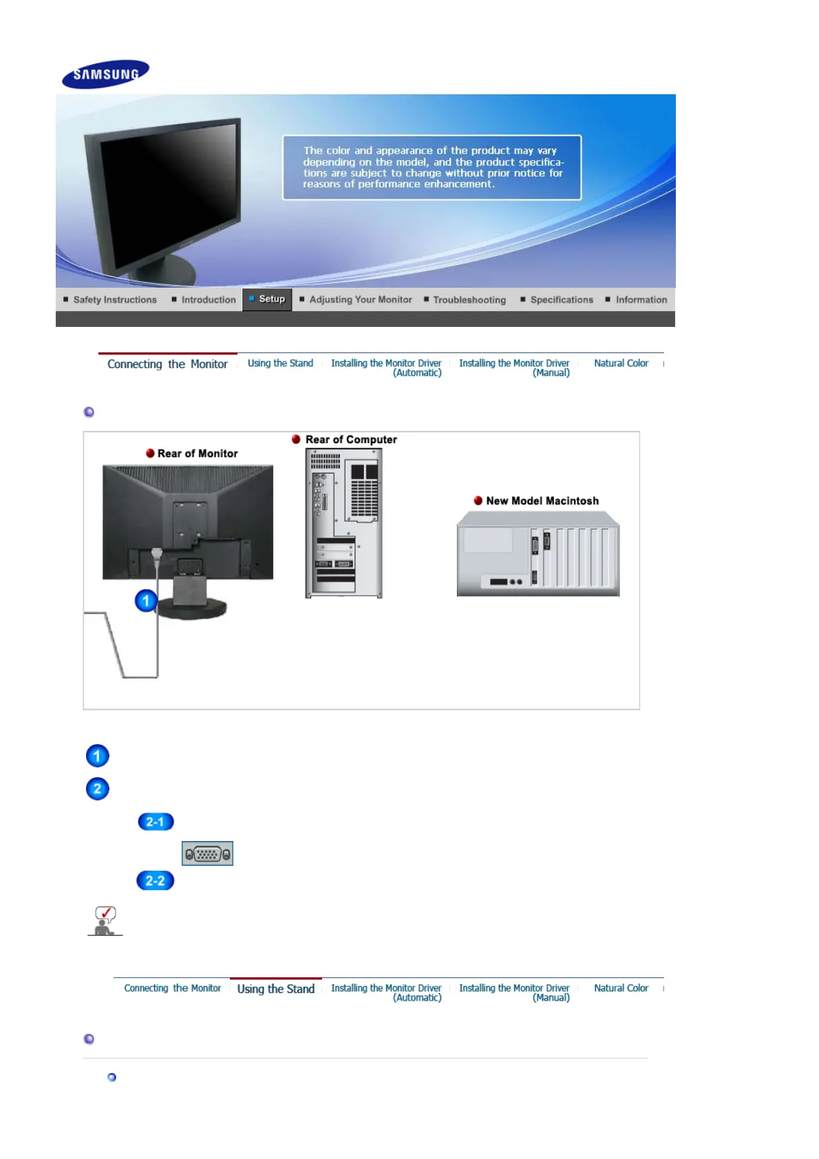 Connect the monitor to the Macintosh computer using the D-sub connection cable.