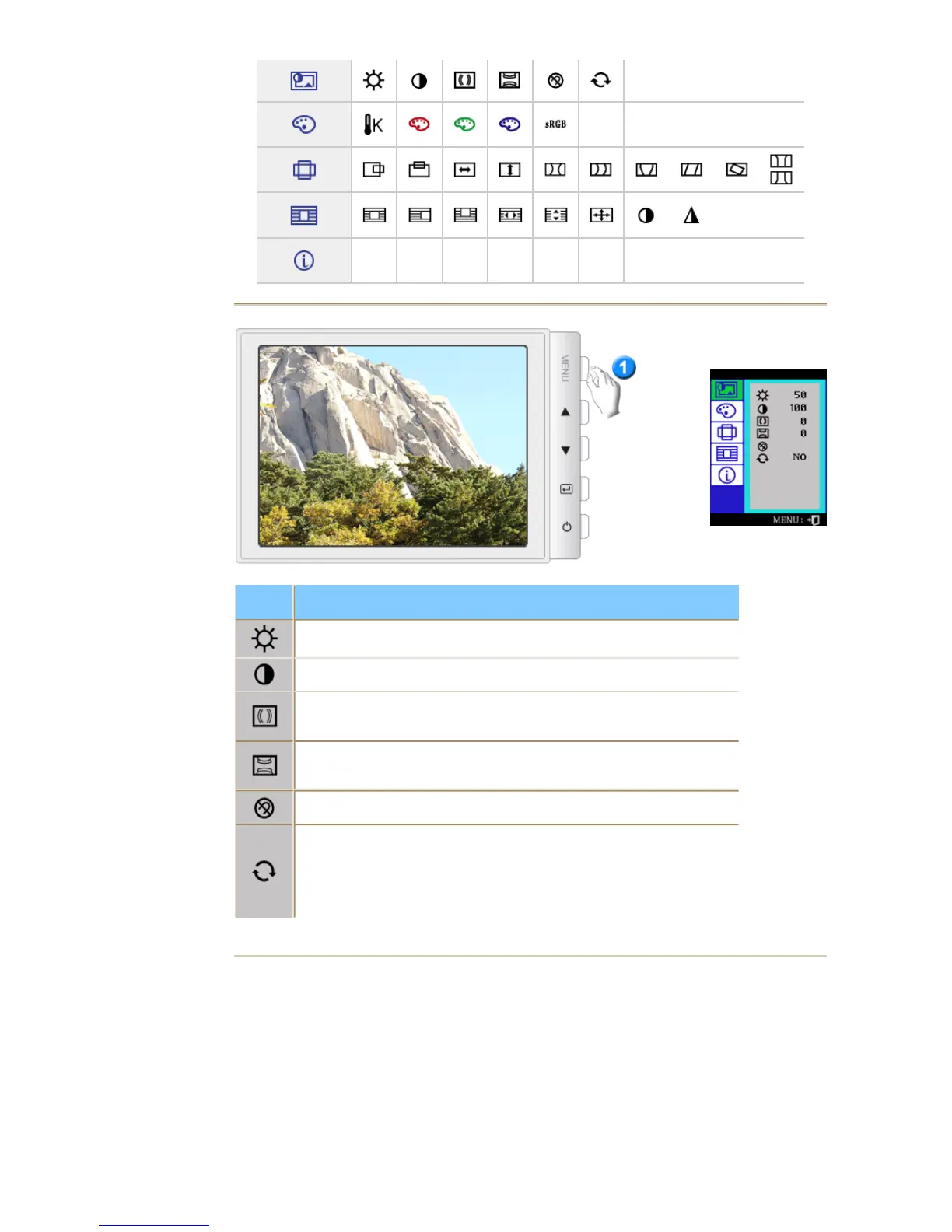 monitorinställningar i sina originallägen:H-Position, V-Position, H-Storlek,