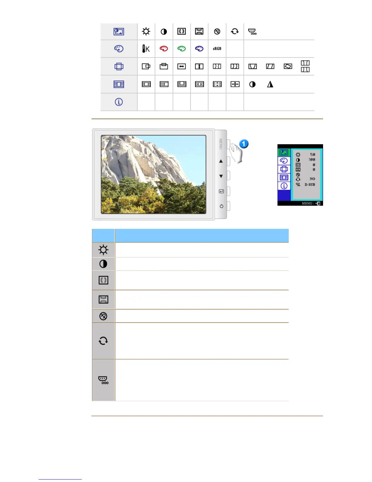 monitorinställningar i sina originallägen:H-Position, V-Position, H-Storlek,