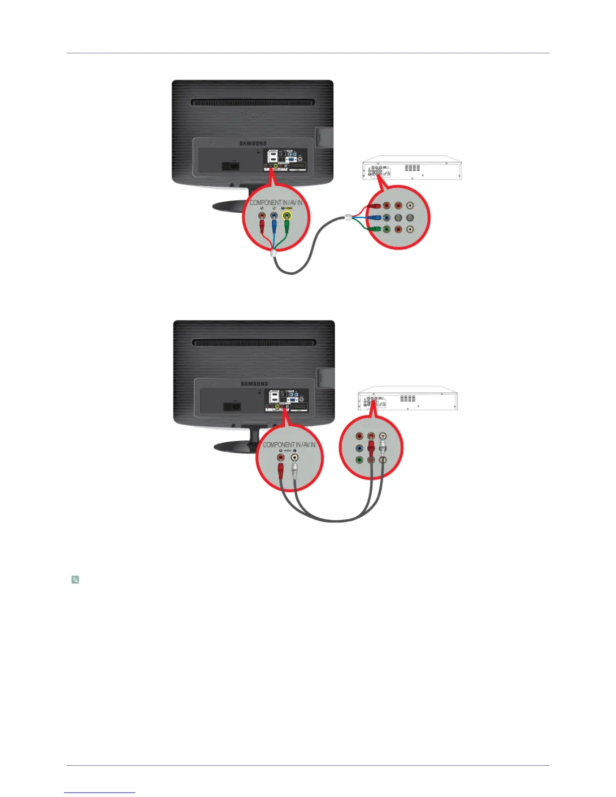 1. Connect the VIDEO OUT port of the AV device (DVD/VCR/Cable/Satellite box) to the [COMPONENT IN / AV IN [P