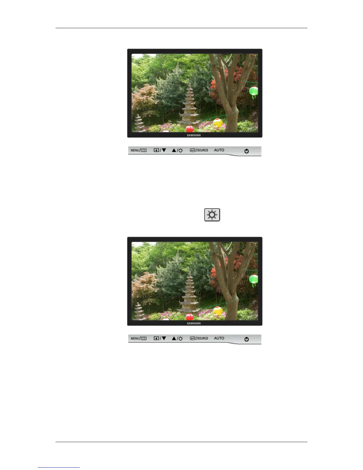 When OSD is not on the screen, push the Brightness ( ) button to adjust brightness.