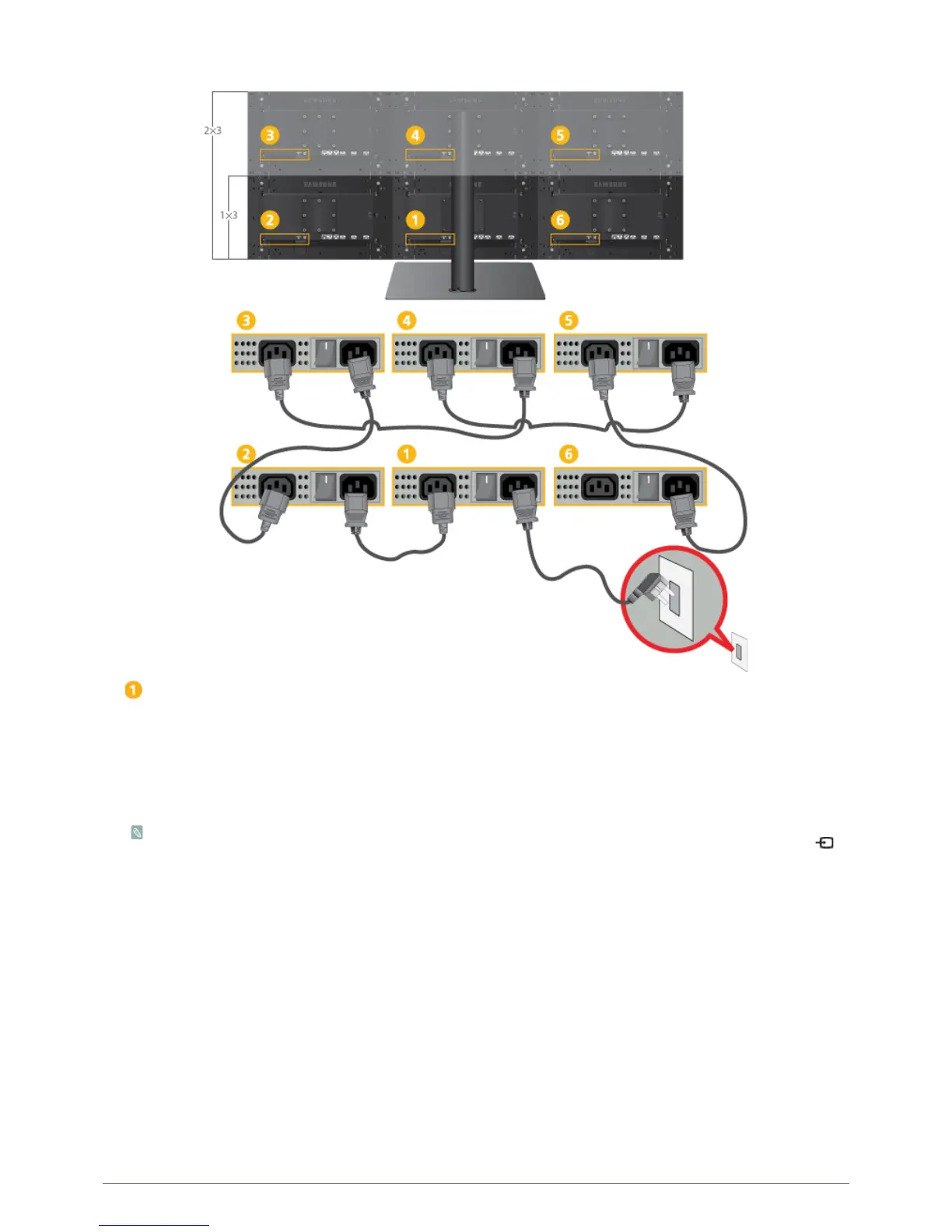 • The power cord can be connected to any of the provided monitors, as required. However, we recommend the connections