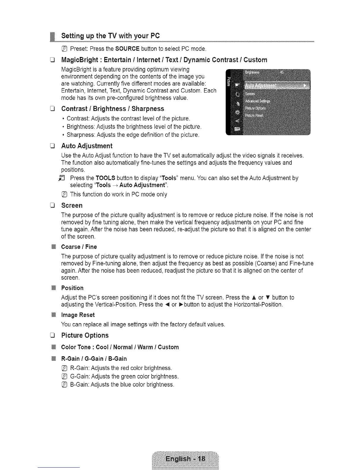 Use the Auto Adjust function to have the TV set automatically adjust the video signals it receives.