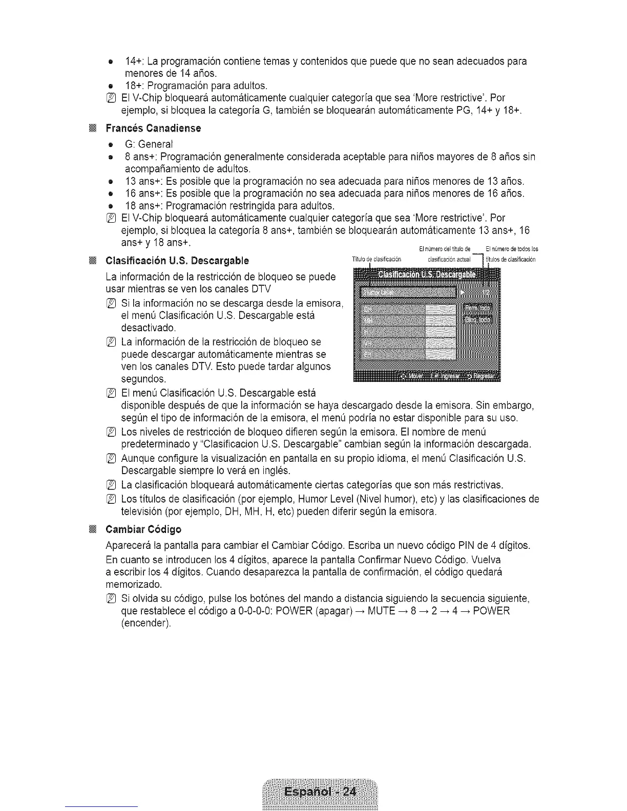 [_ Aunque configure la visualizaci6n en pantalla en su propio idioma, el menOClasificaci6n U.S.