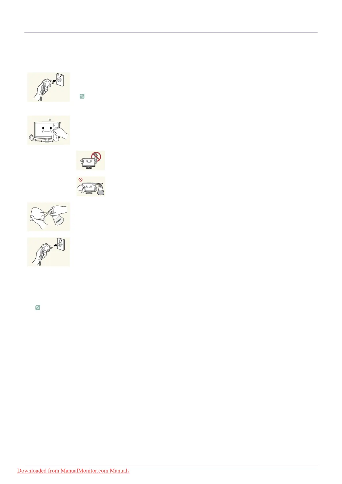 • Do not spray water or cleaning agent directly onto the monitor.