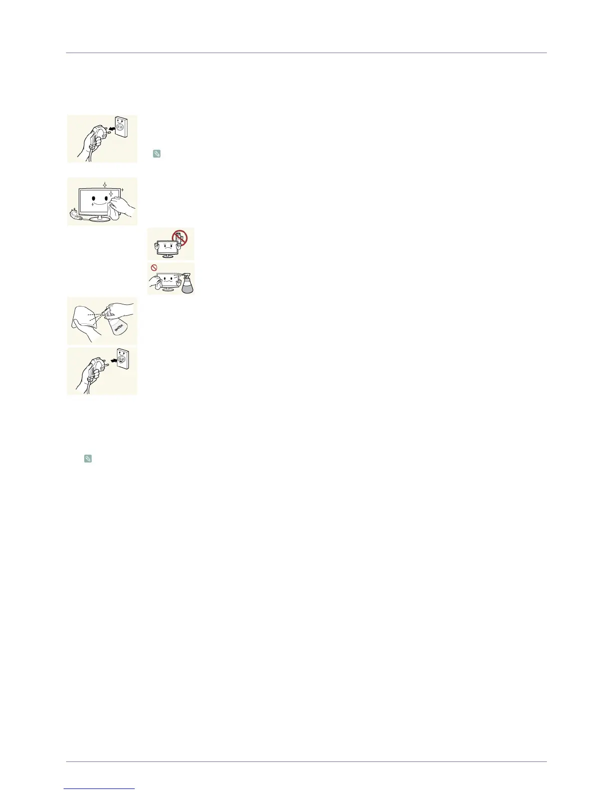 • Do not spray water or cleaning agent directly onto the monitor.