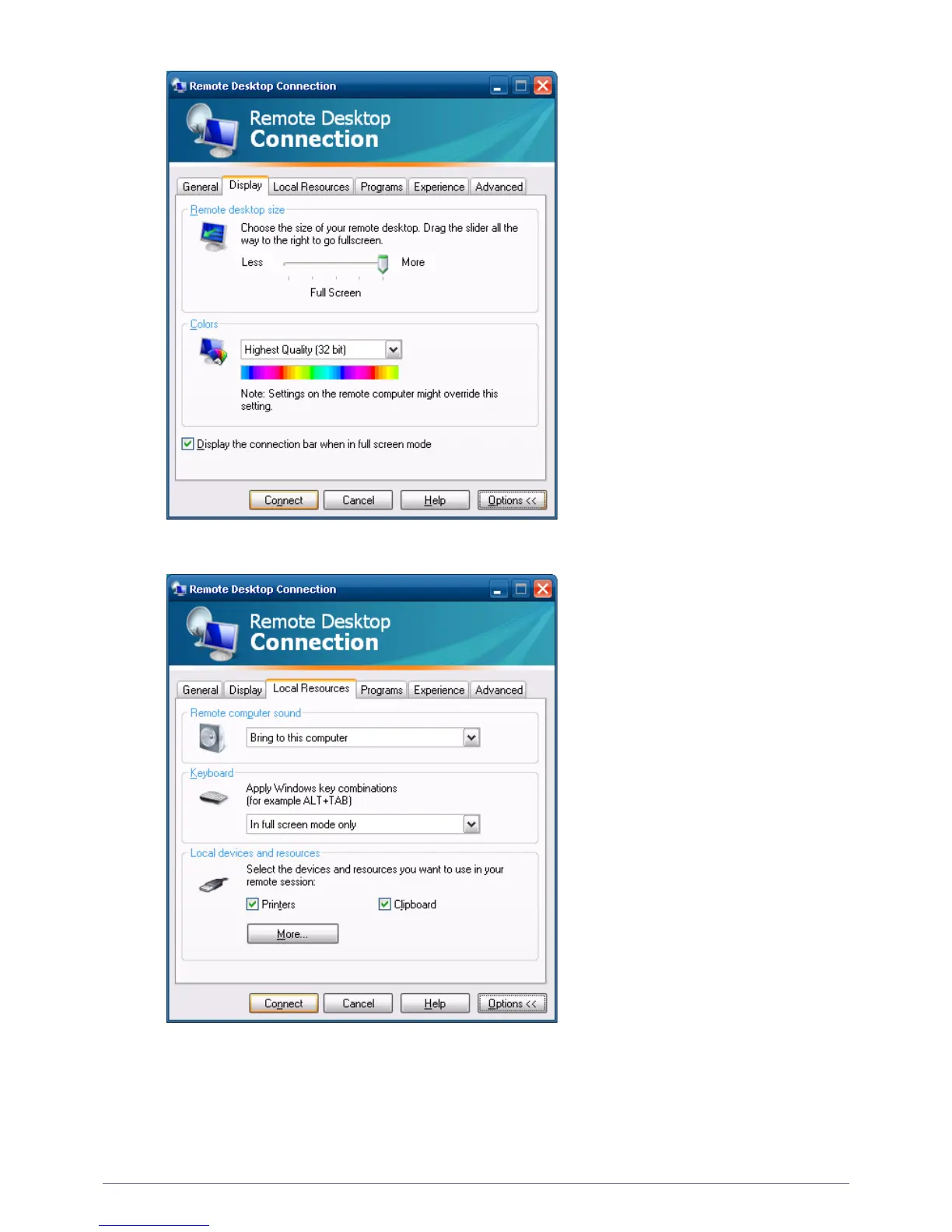 - Programs : Specify whether to display the Desktop or run an application whenever you are connected. The default is