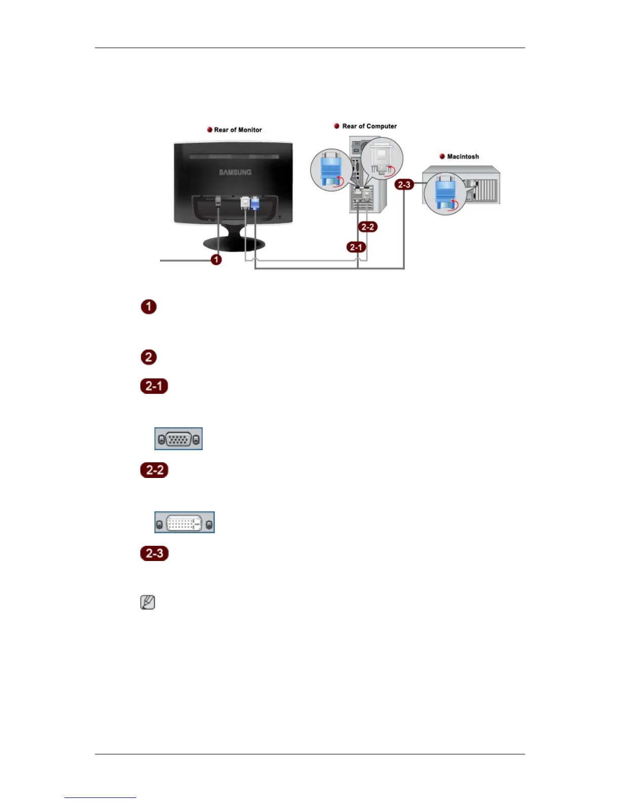 • Connect the monitor to the Macintosh computer using the D-sub connection cable.