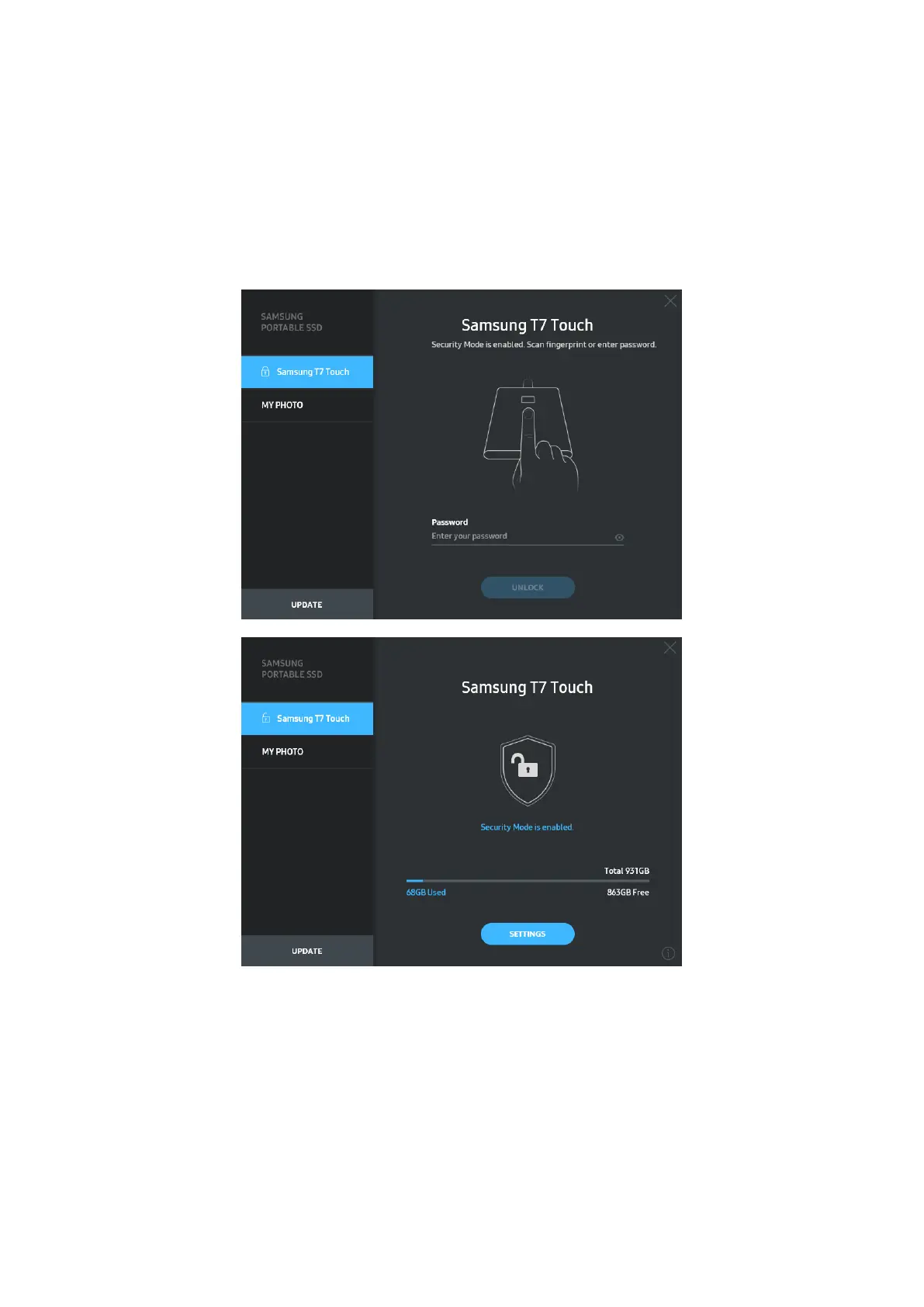 * If security mode is enabled, only the capacity of security partition in the T7 Touch will be initially displayed.