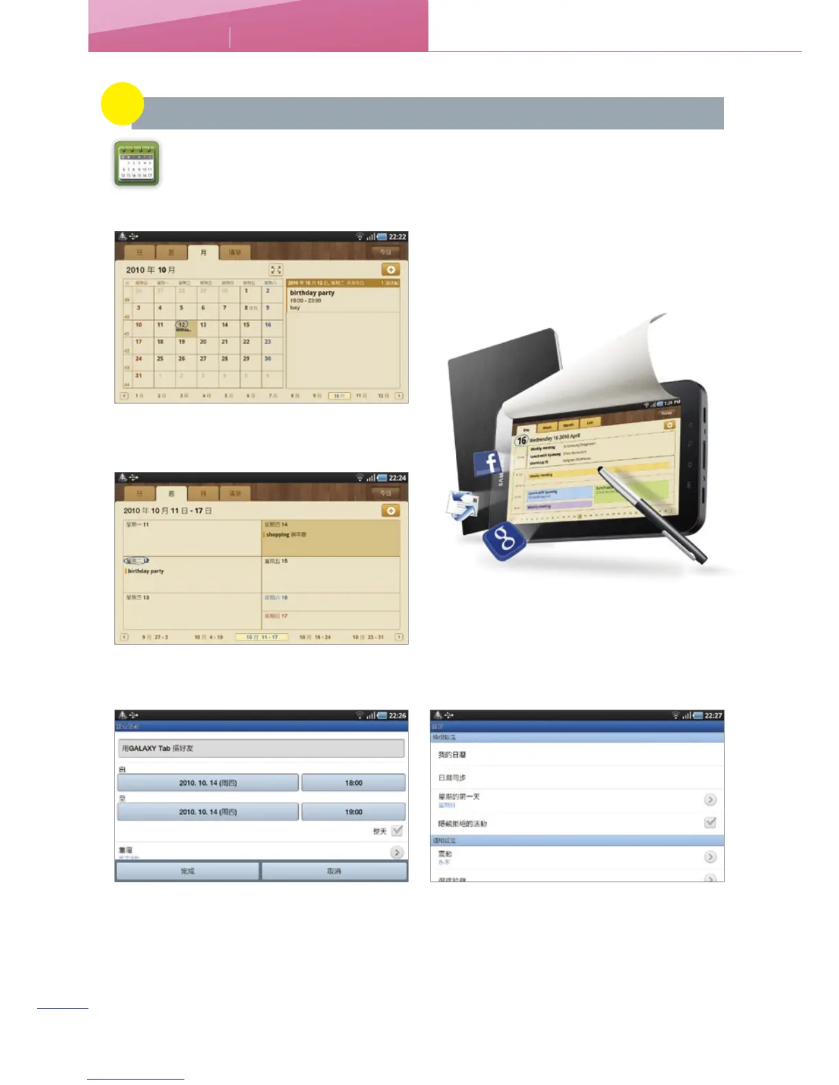 GALAXY Tab的「日曆」功能,針對Tab的高解析螢幕做了最佳化設定,除了基本可以