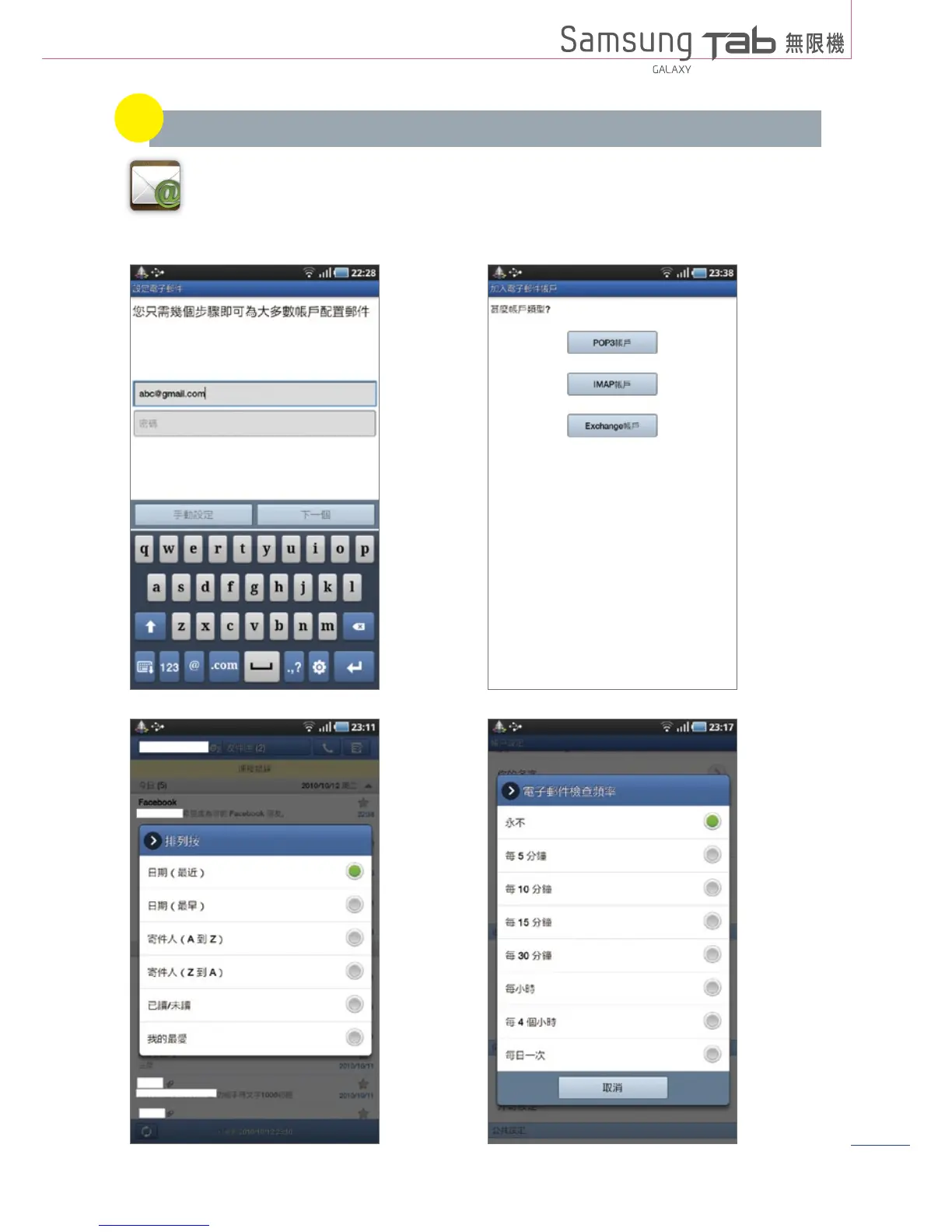 身為行動上網裝置,GALAXY Tab然也支援各種不同E-mail箱收發的功能,包含