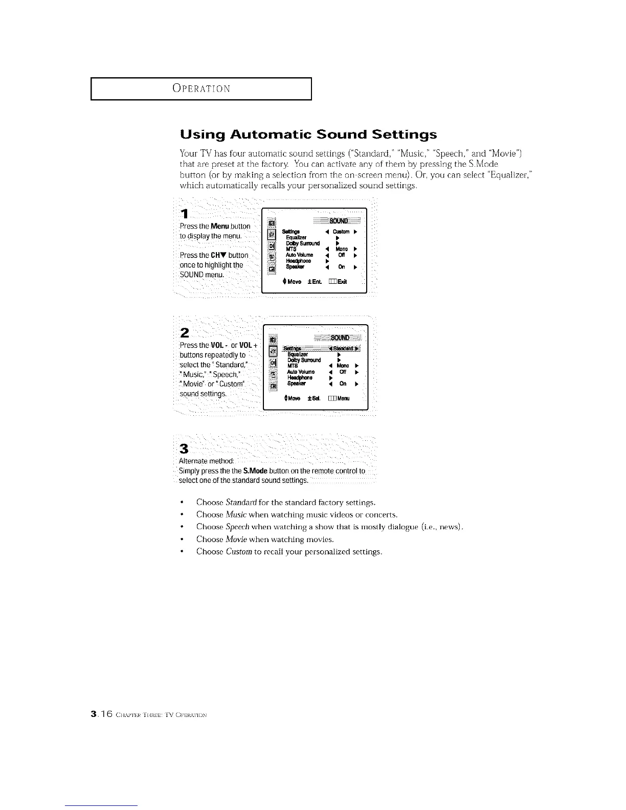 Your TV has four automatic sound settings ("Standard," "Music," "Speech," and "Movie")