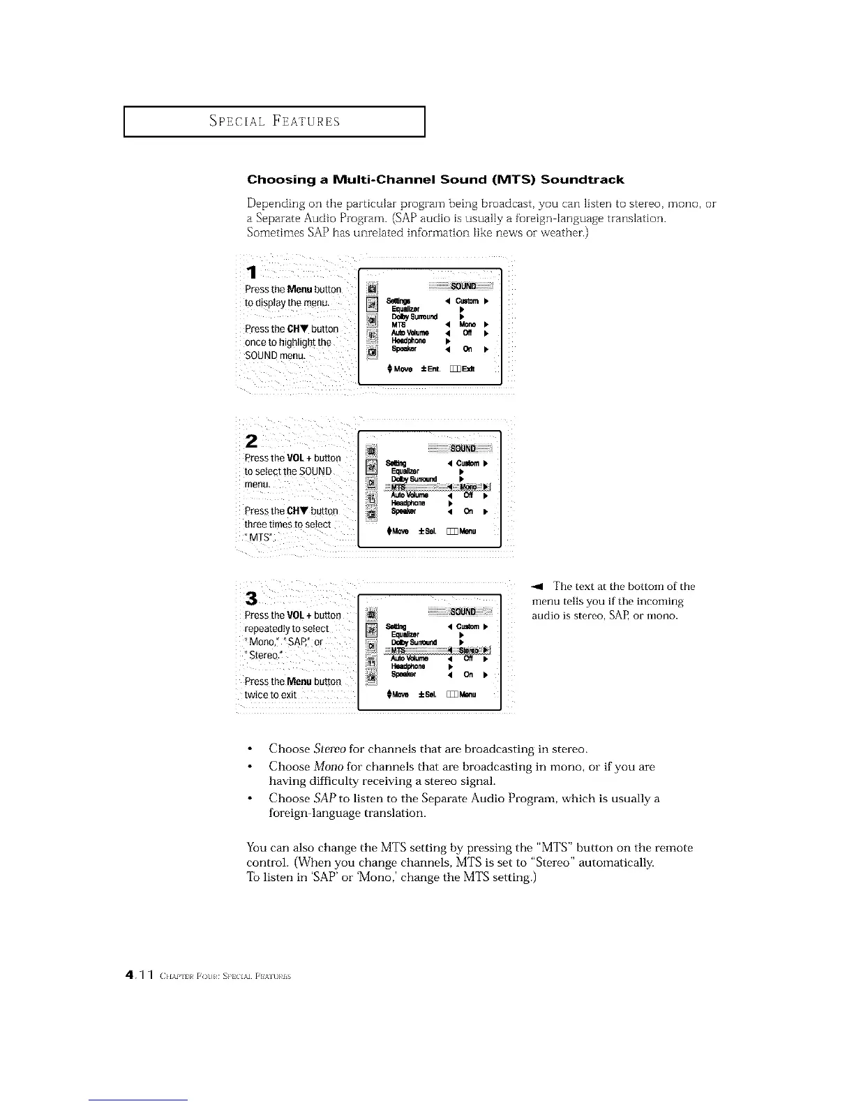 To listen in 'SAP'or 'Mono,' change the MTS setting.)