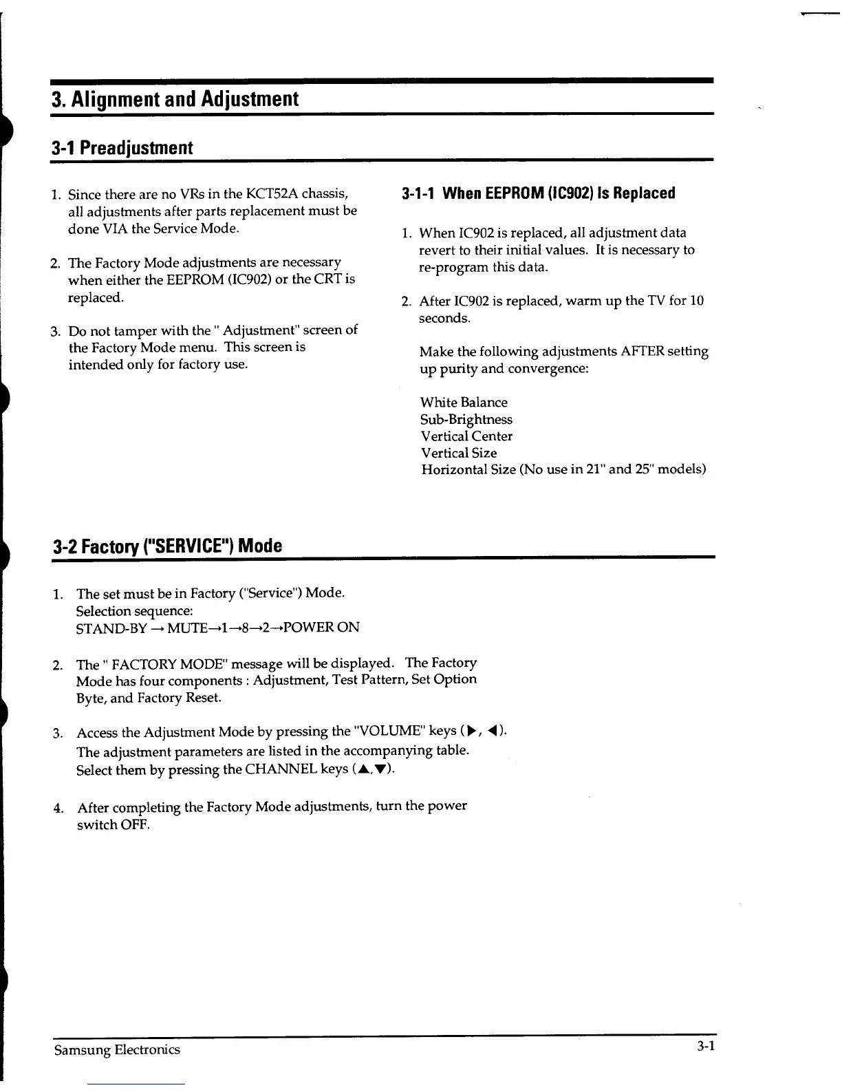 Samsung TXE2045 - 3. Alignment and Adjustment; 3-1 Preadjustment; 3-2 Factory (SERVICE) Mode