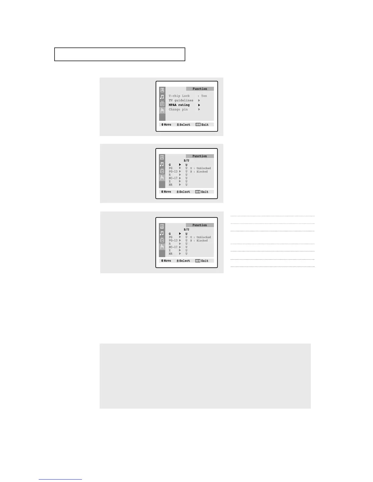 Note: The V-Chip will automatically block any category that is “more restrictive.” For example, if you