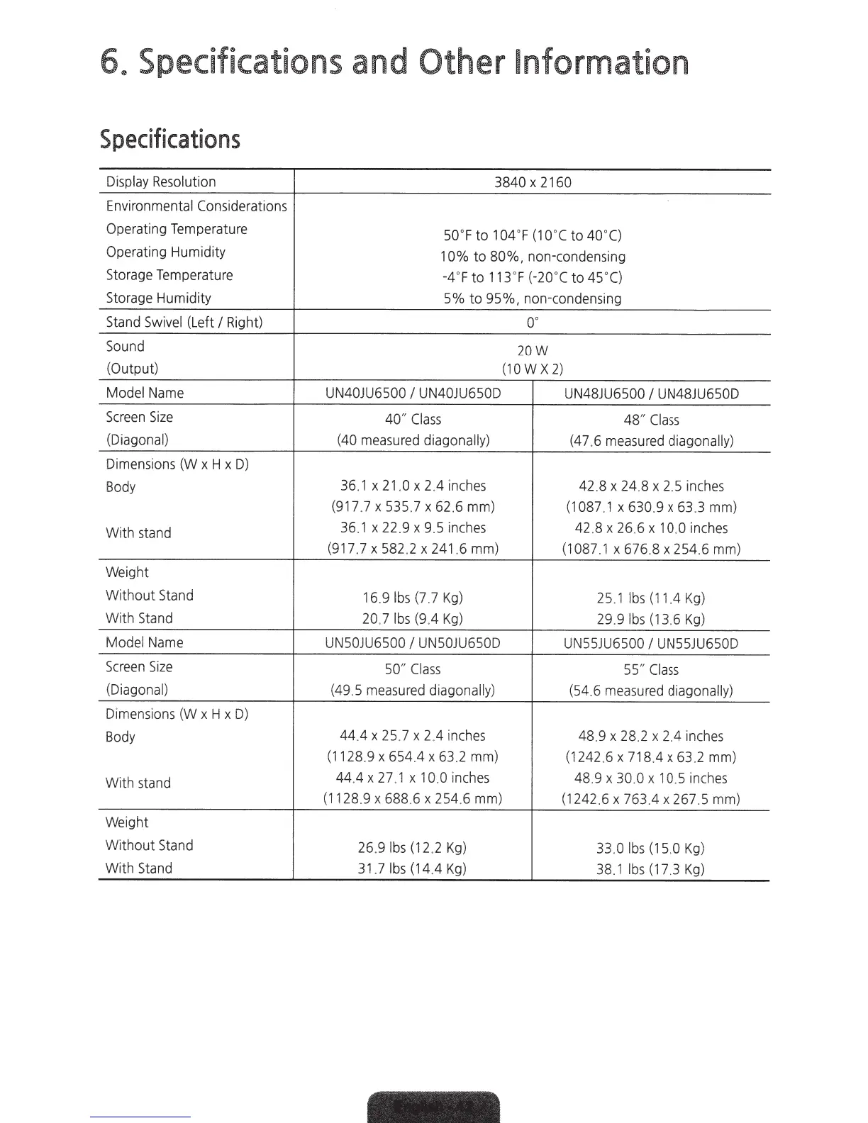 Samsung UN55JU650D - 6. Specifications and Other Information; Product Specifications