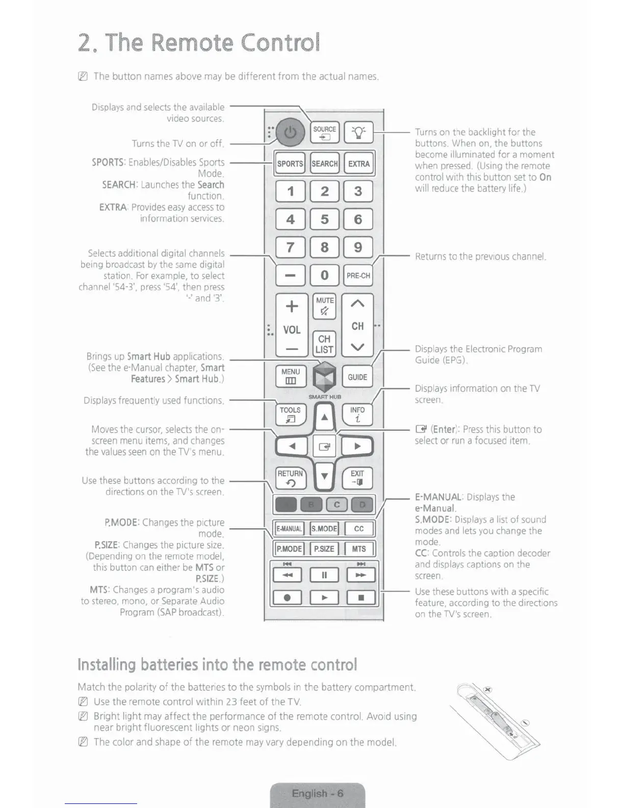 Samsung UN65JU650D - The Remote Control; Remote Control Button Functions; Installing Remote Batteries