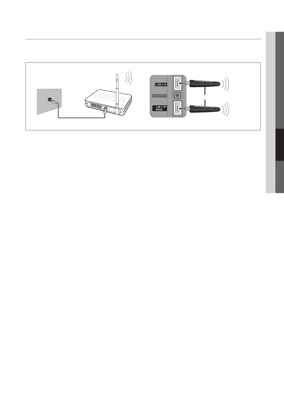 To connect your TV to your network wirelessly, you need a wireless router or modem and a Samsung Wireless LAN Adapter