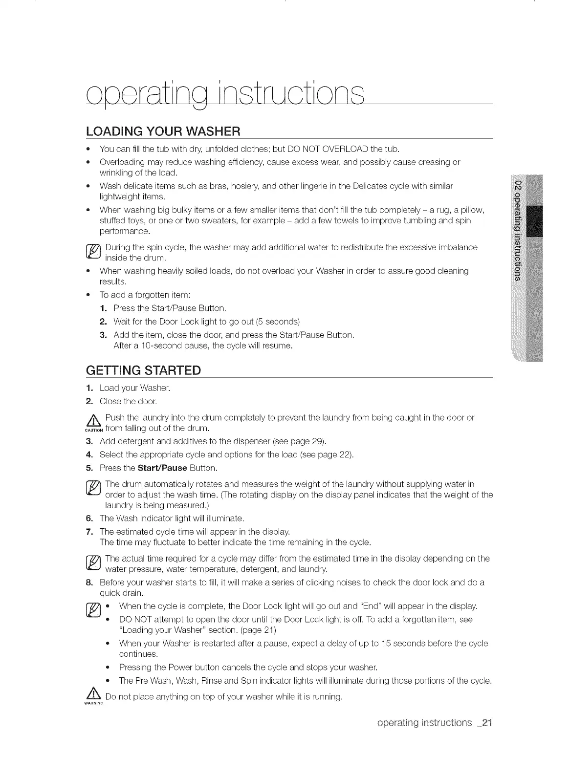 When your Washer is restarted after a pause, expect a delay of up to 15 seconds before the cycle