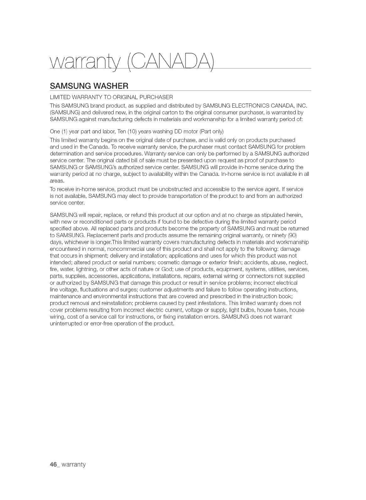 and used in the Canada. To receive warranty service, the purchaser must contact SAMSUNG for problem