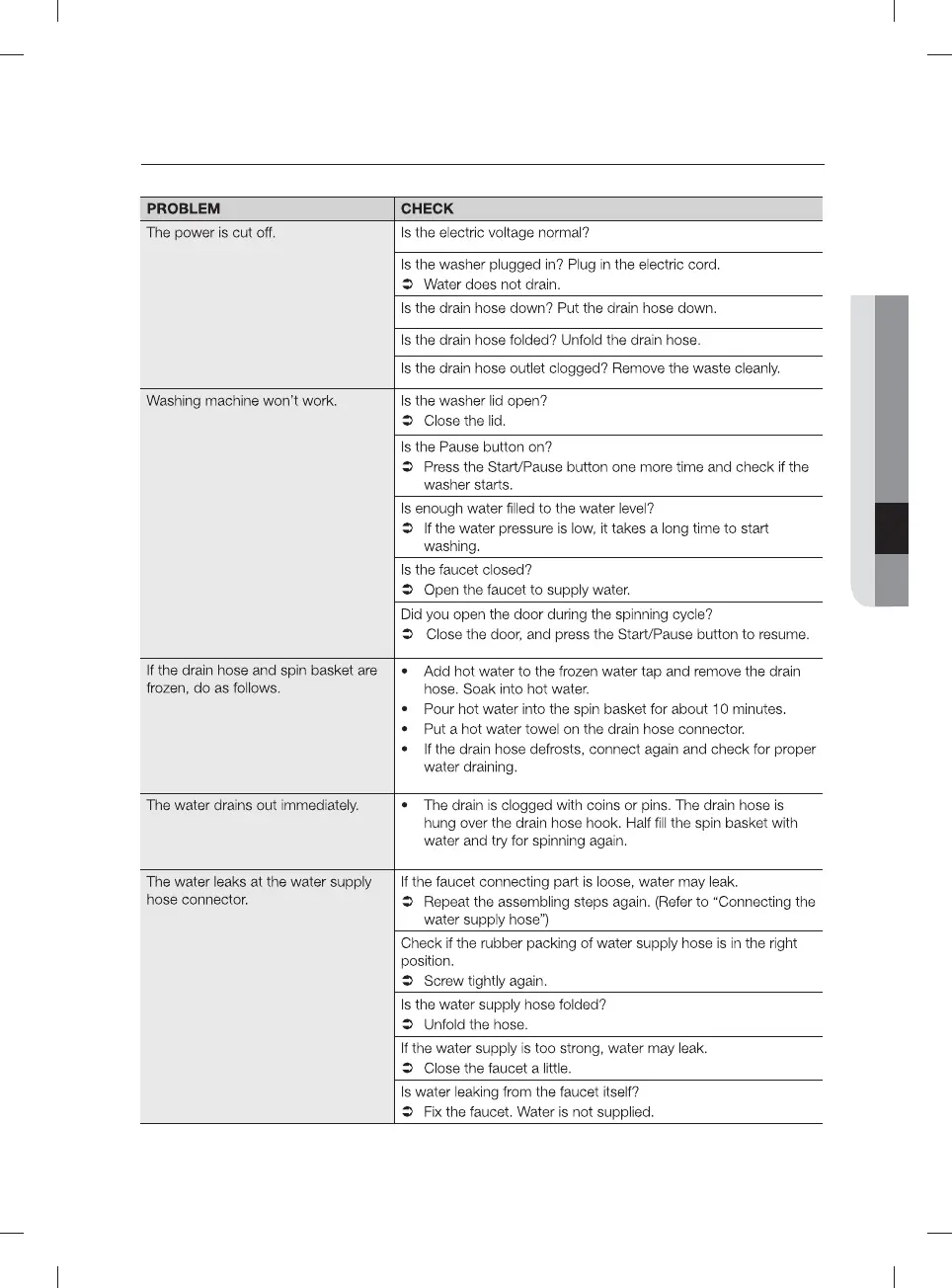 Samsung WA18F7S8 - Power cut or machine not working; Frozen drain hose or spin basket; Immediate water drainage issues; Water leaks at supply hose connector