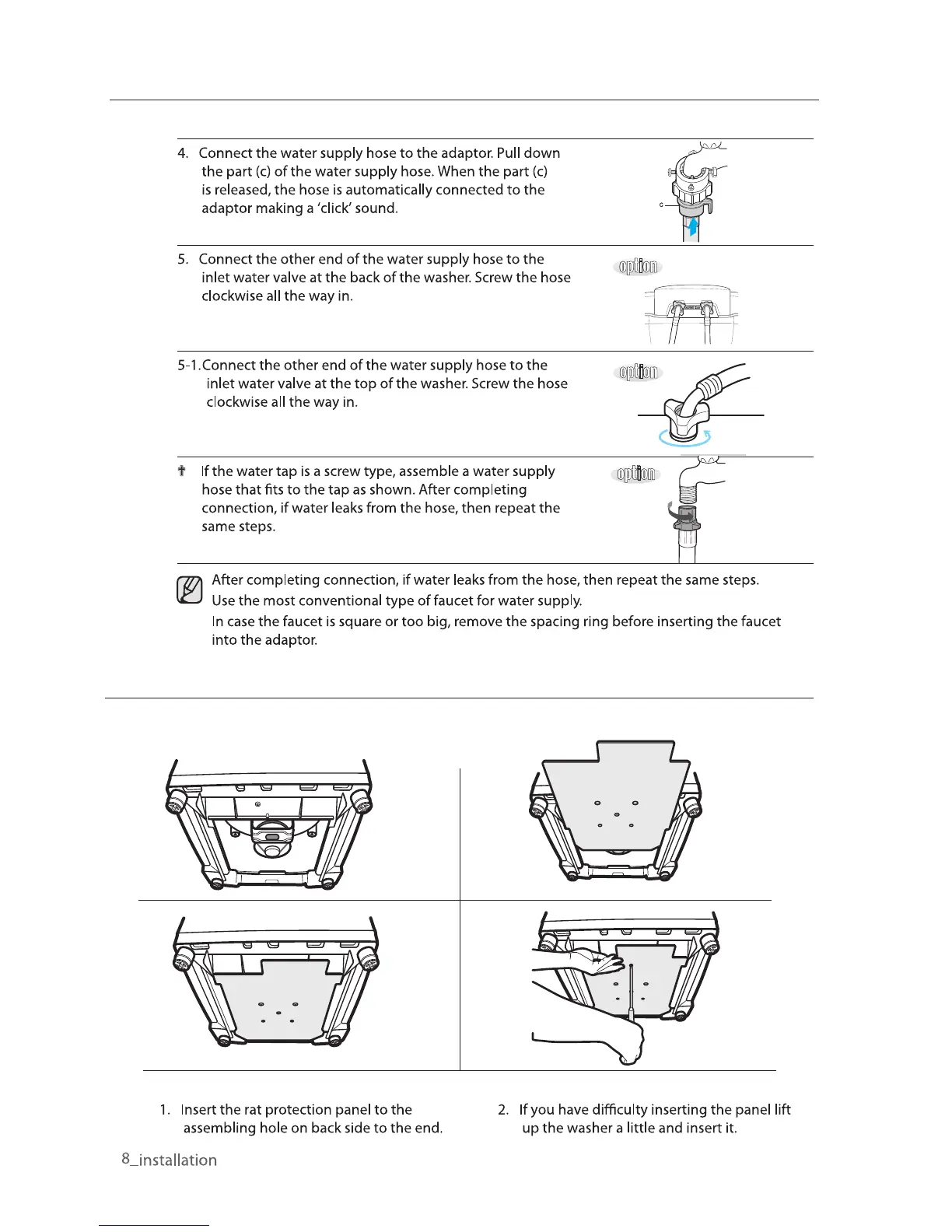 Samsung WA95BWP - Installation Procedures Continued; Water Supply Hose Connection Details; Assembling the Rat Protection Panel