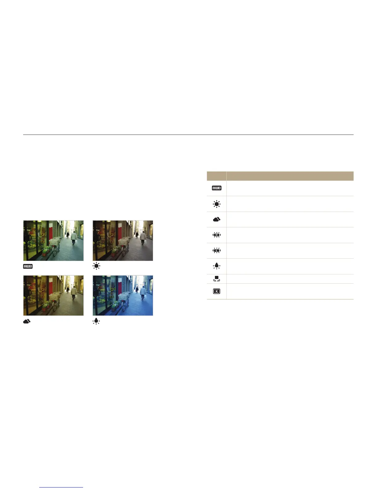 balance, such as Auto WB, Daylight, Cloudy, or Tungsten, or
