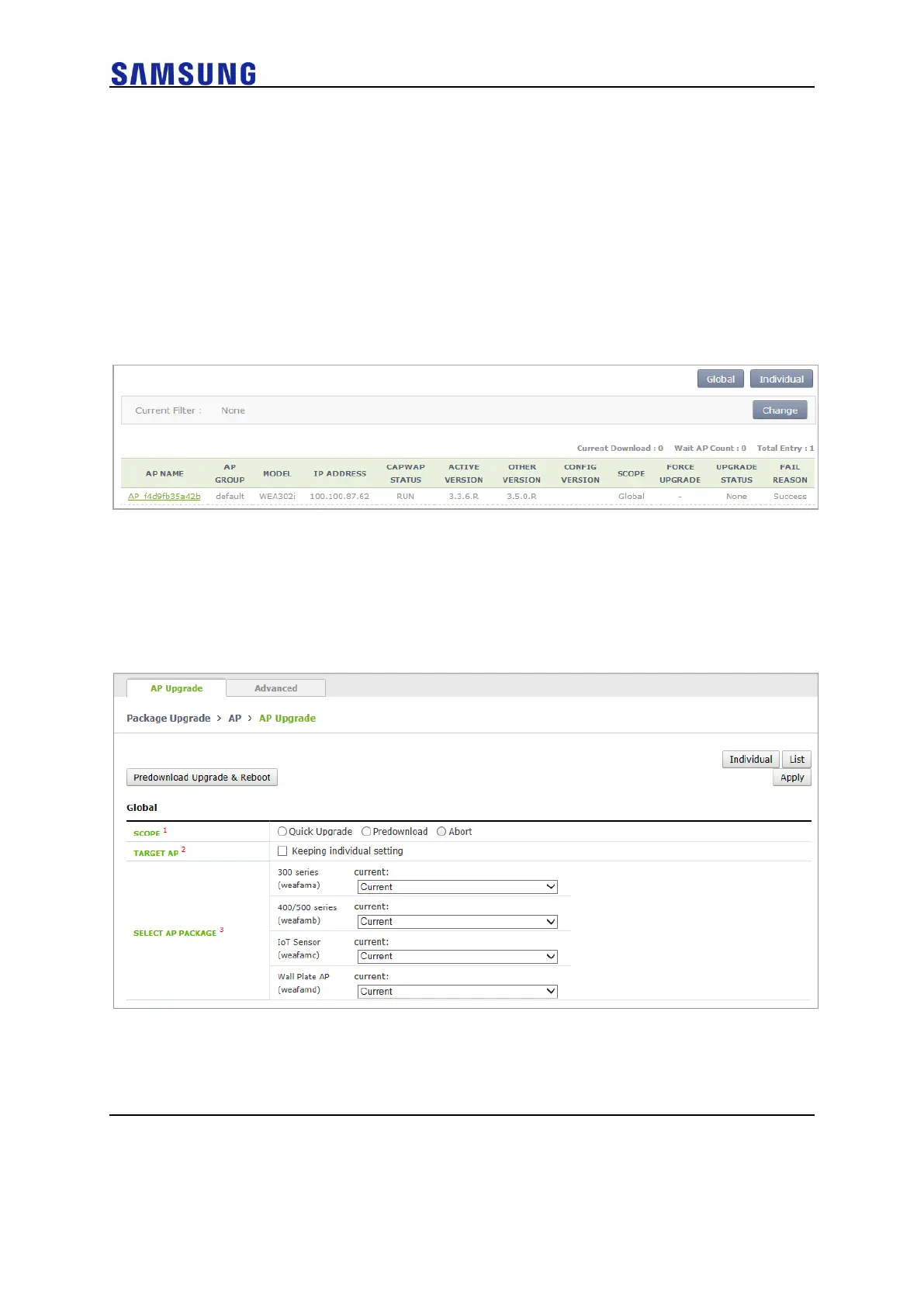 AP Upgrade tab upgrades all the APs or a specific AP.