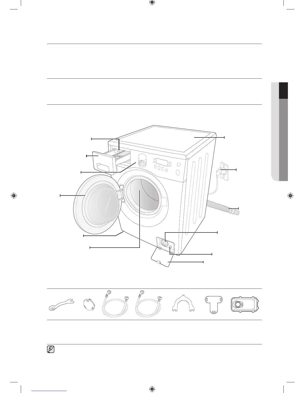 Pakk vaskemaskinen nøye ut og sørg for at du har mottatt alle delene som vises nedenfor. Hvis