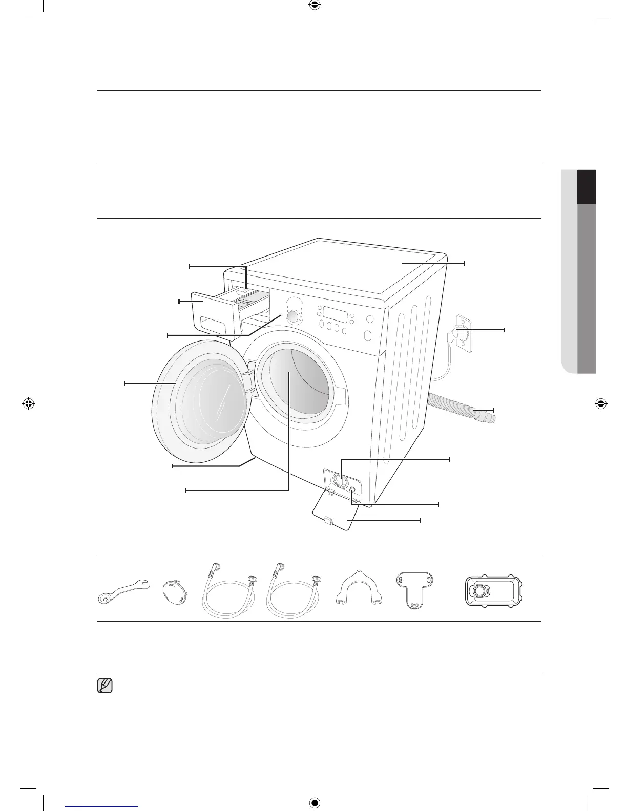Pak forsigtigt alle dele til vaskemaskinen ud, så du er sikker på at have modtaget alle nedenfor viste dele.