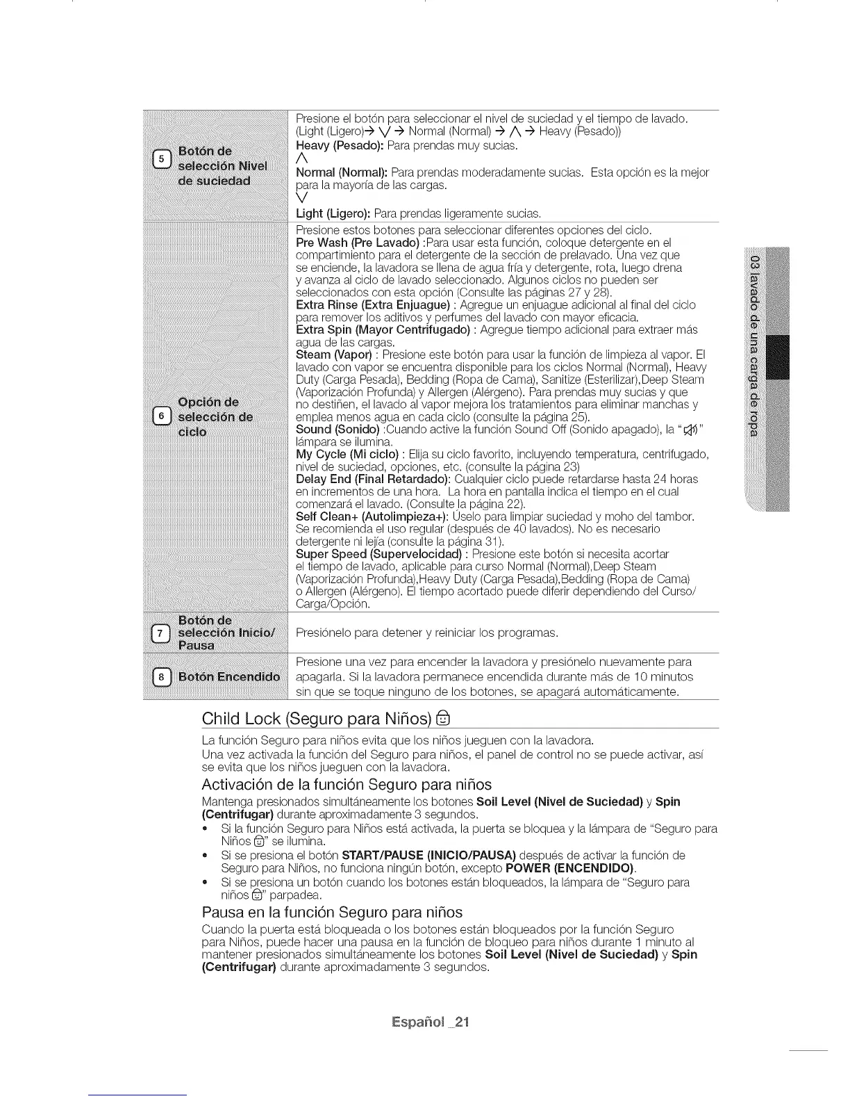 Pre Wash (Pre Lavado) :Para usar esta funci6n, coloque detergente en el