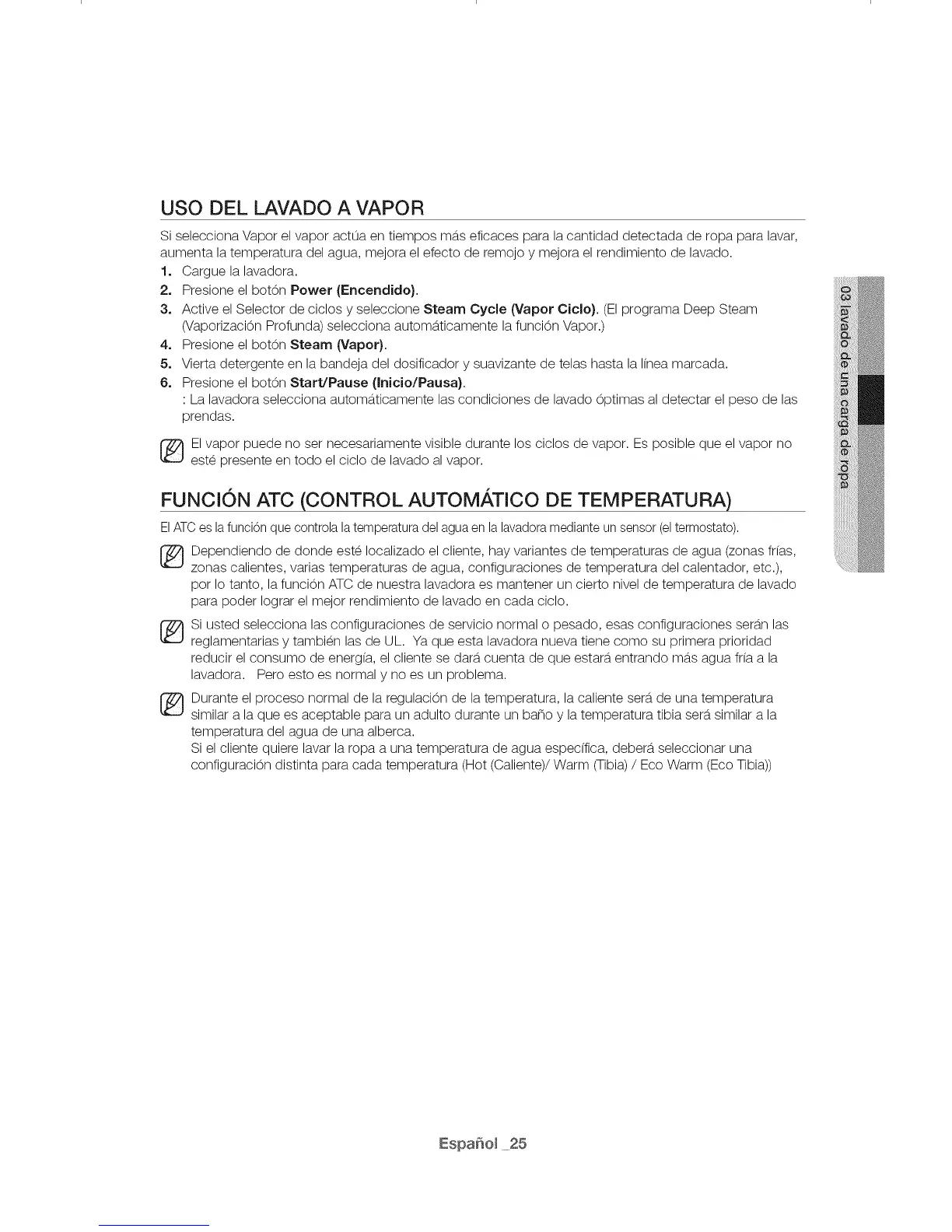 Si selecciona Vapor el vapor actOa en tiempos m&.seficaces para la cantidad detectada de ropa para lavar,