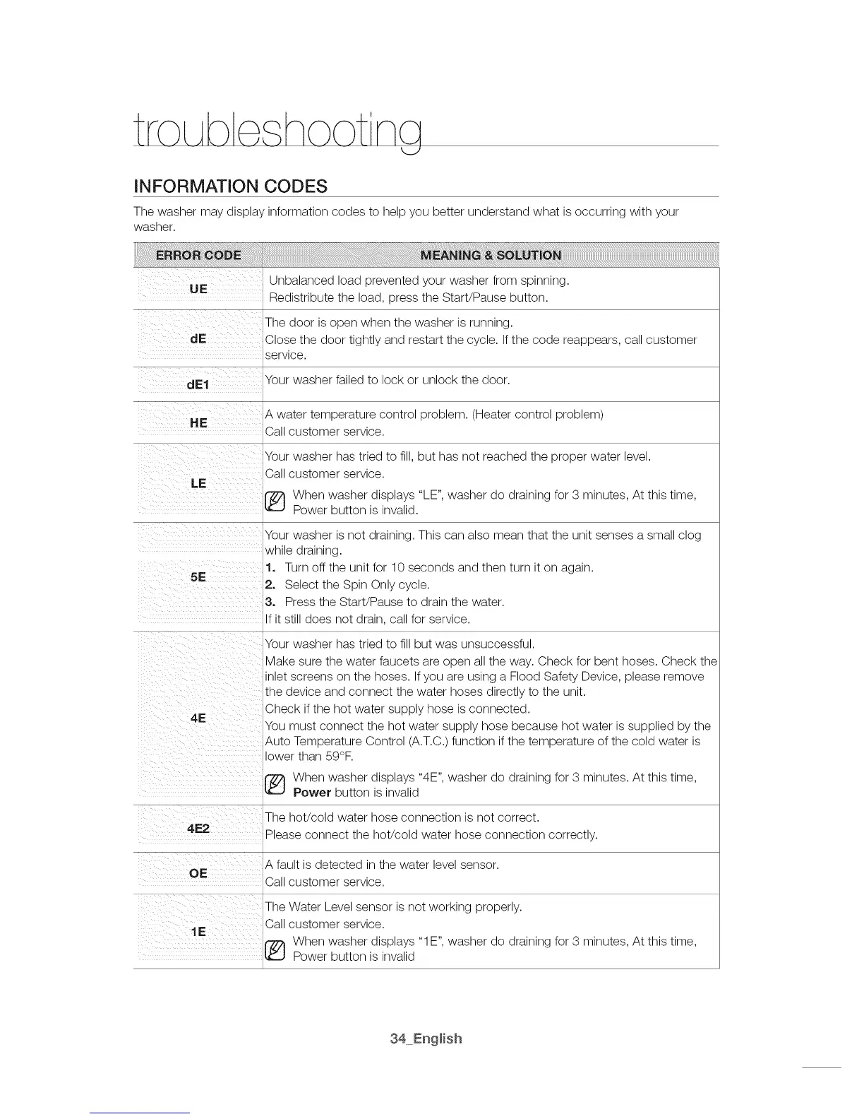 [_ hen washer displays "1E", washer do draining for 3 minutes, At this time,