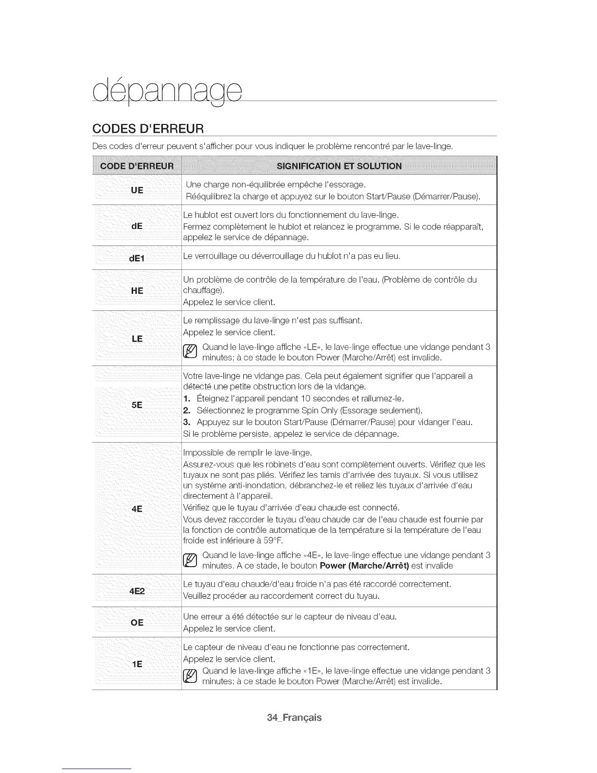 Des codes d'erreur peuvent s'afficher pour vous indiquer le probl_me rencontr_ par le lave-linge.