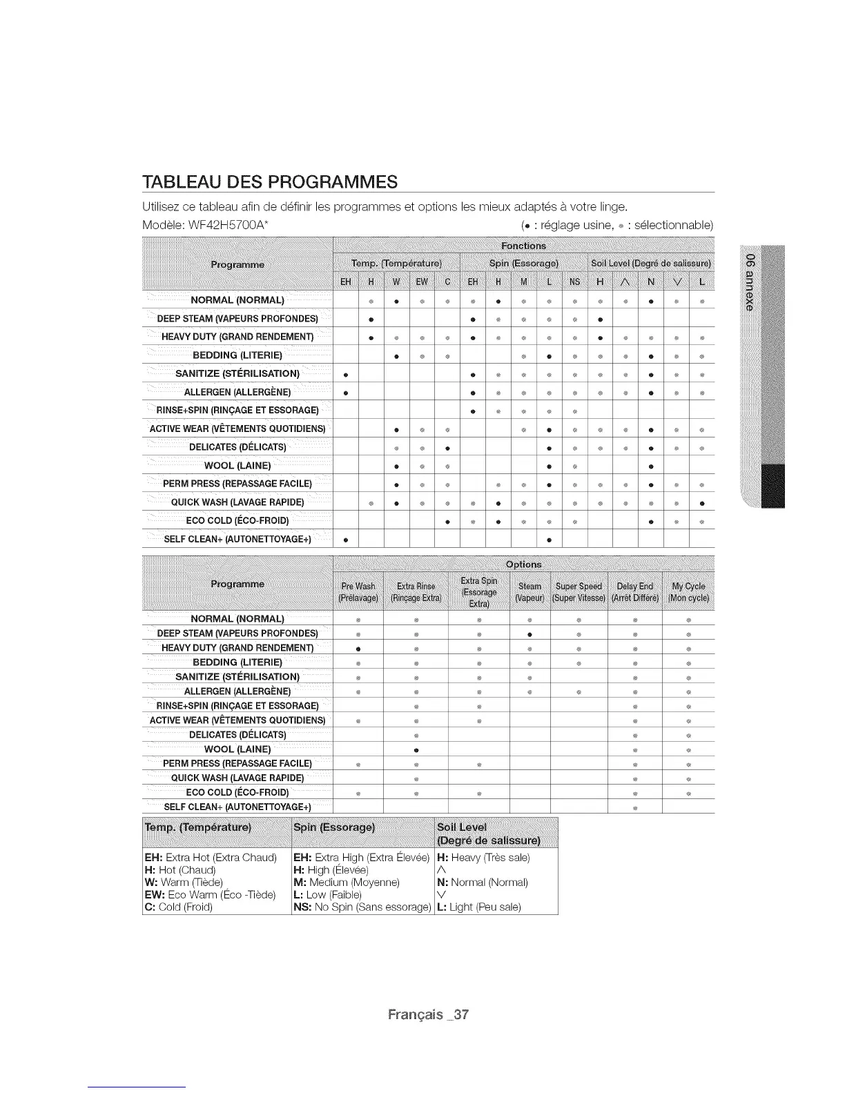 Utilisez ce tableau afin de d_finir les programmes et options les mieux adapt_s b.votre linge.