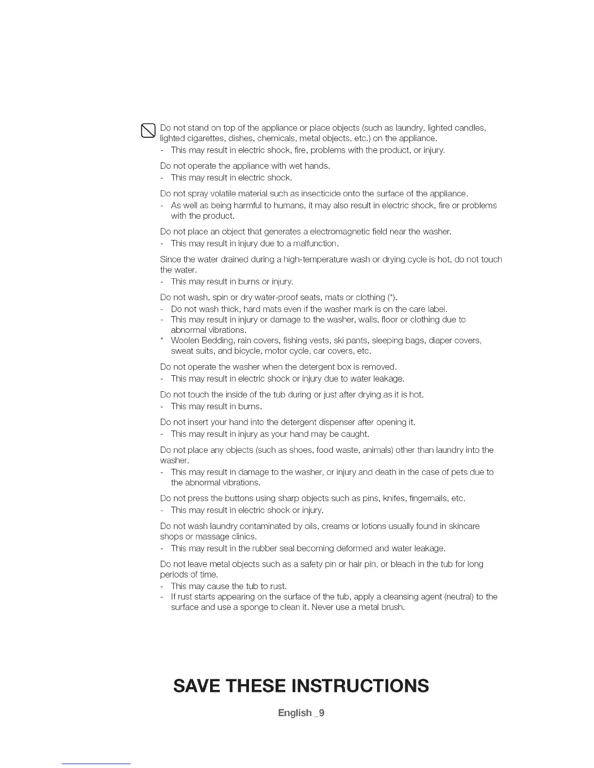 Do not stand on top of the appliance or place objects (such as laundry, lighted candles,