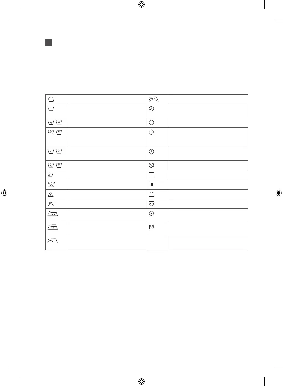 Šie simboliai nurodo, kaip prižiūrėti drabužius. Priežiūros etiketėje pateikiami keturi simboliai tokia tvarka: skalbimas, balinimas,