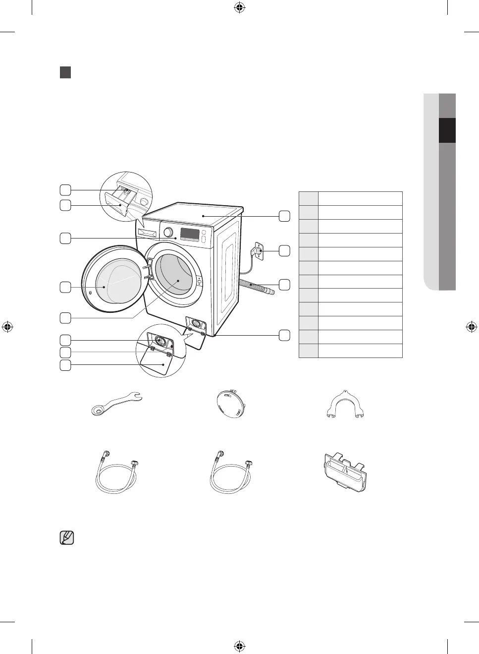 Uzmanīgi noņemiet iepakojumu no veļas mazgājamās mašīnas un pārliecinieties, vai ir saņemtas visas turpmāk norādītās detaļas. Ja